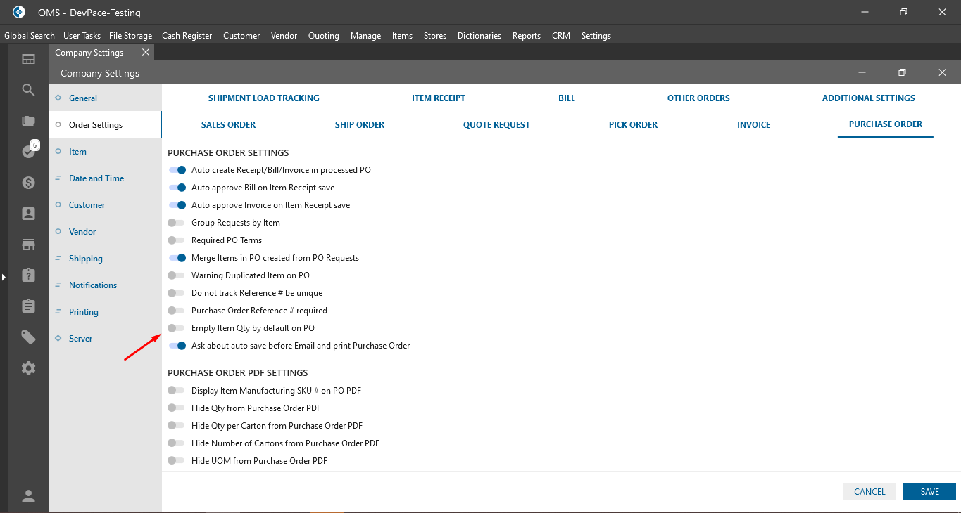 - was added to the “Purchase Order Settings” block -> next to the “Purchase Order Reference # is required” checkbox;