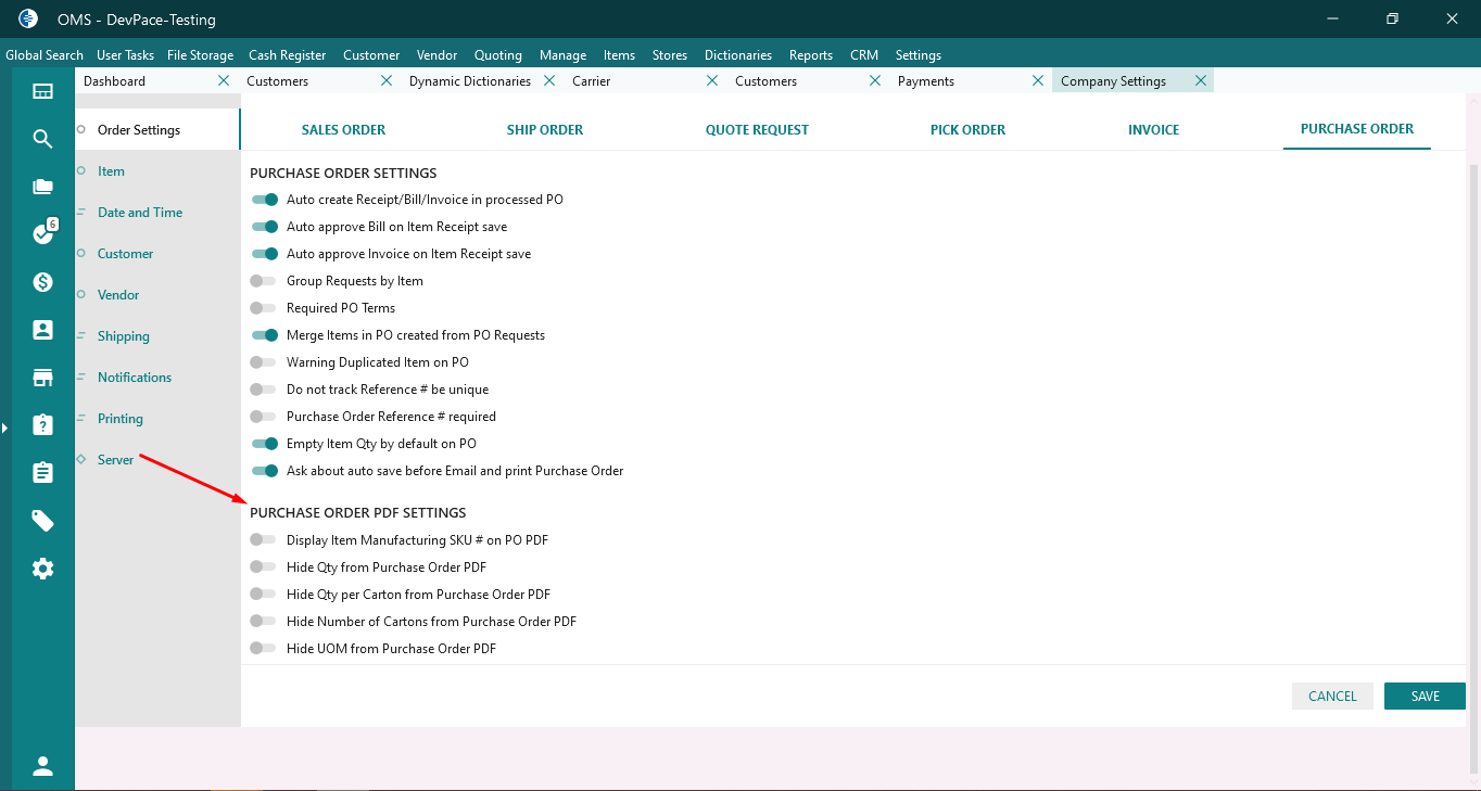 - were added next to the “Display Item Manufacturing # on the PO PDF ” checkbox;
