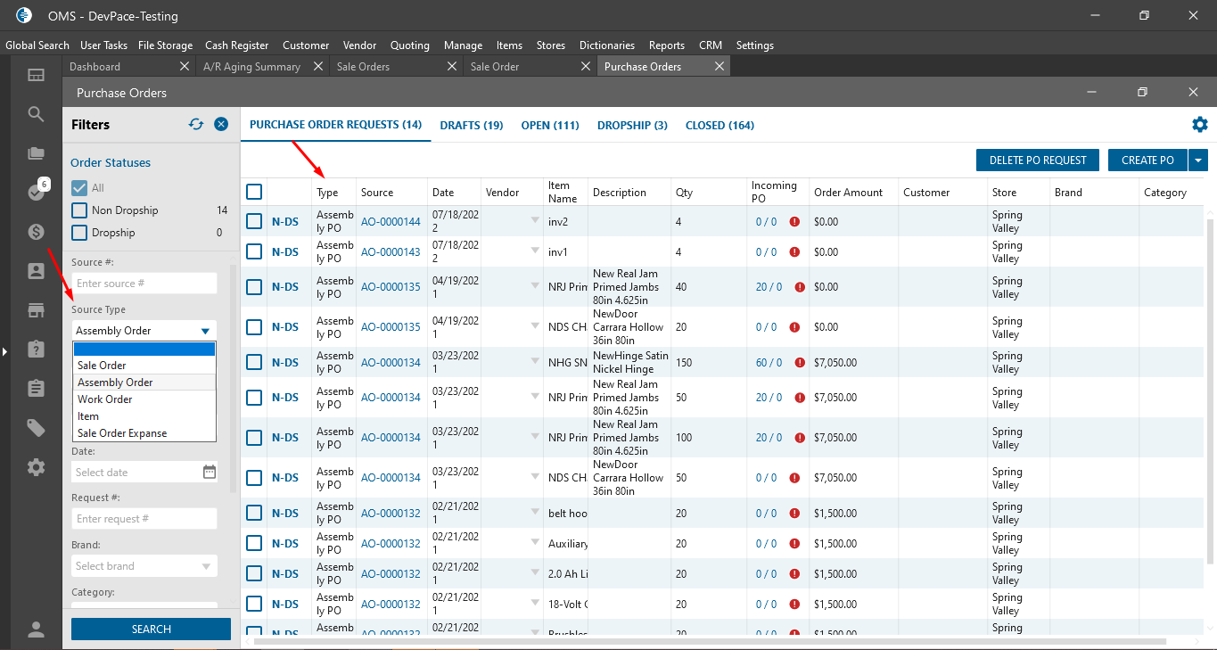 - if the type is checked in the dropdown -> the Datagrid is filtered by the “Type” column.