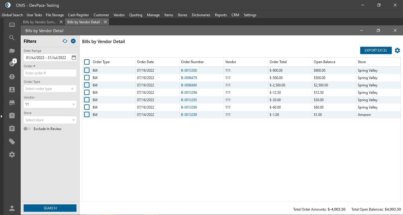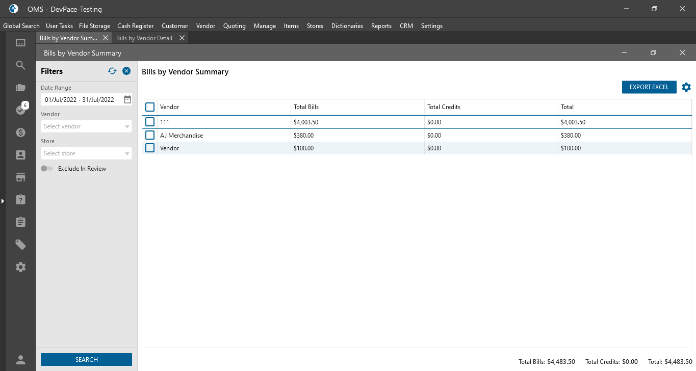 - Bills by Vendor Detail;