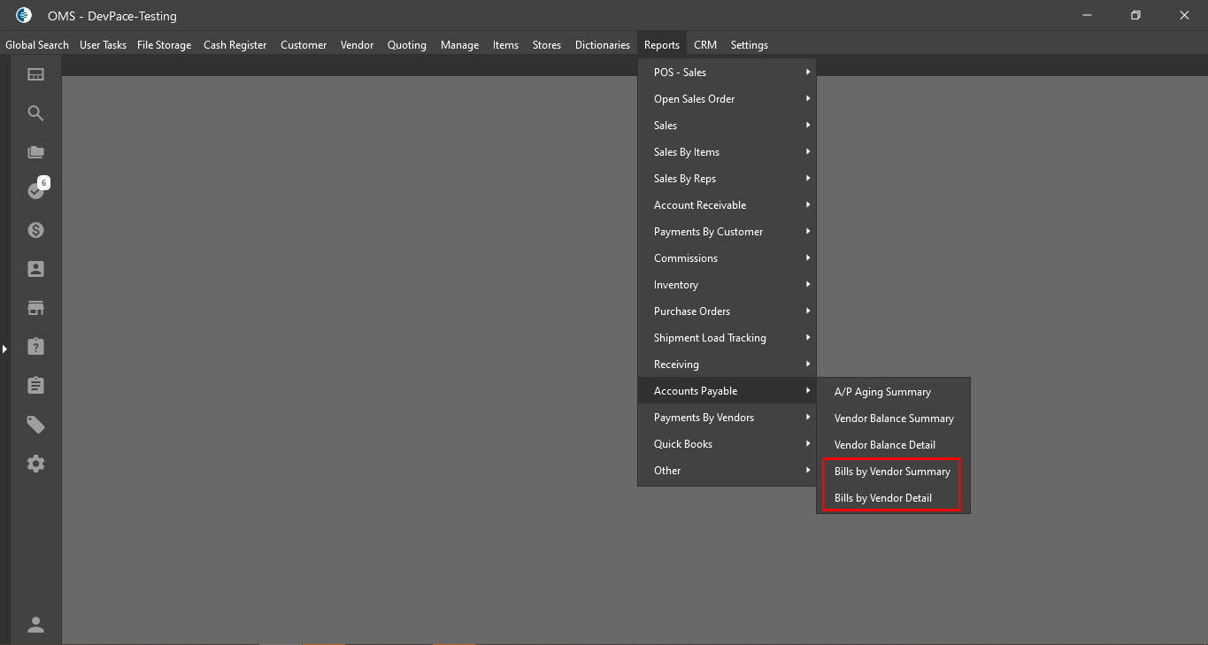 - “Bills by Vendor Detail” Report is hidden from the Report Menu List form.