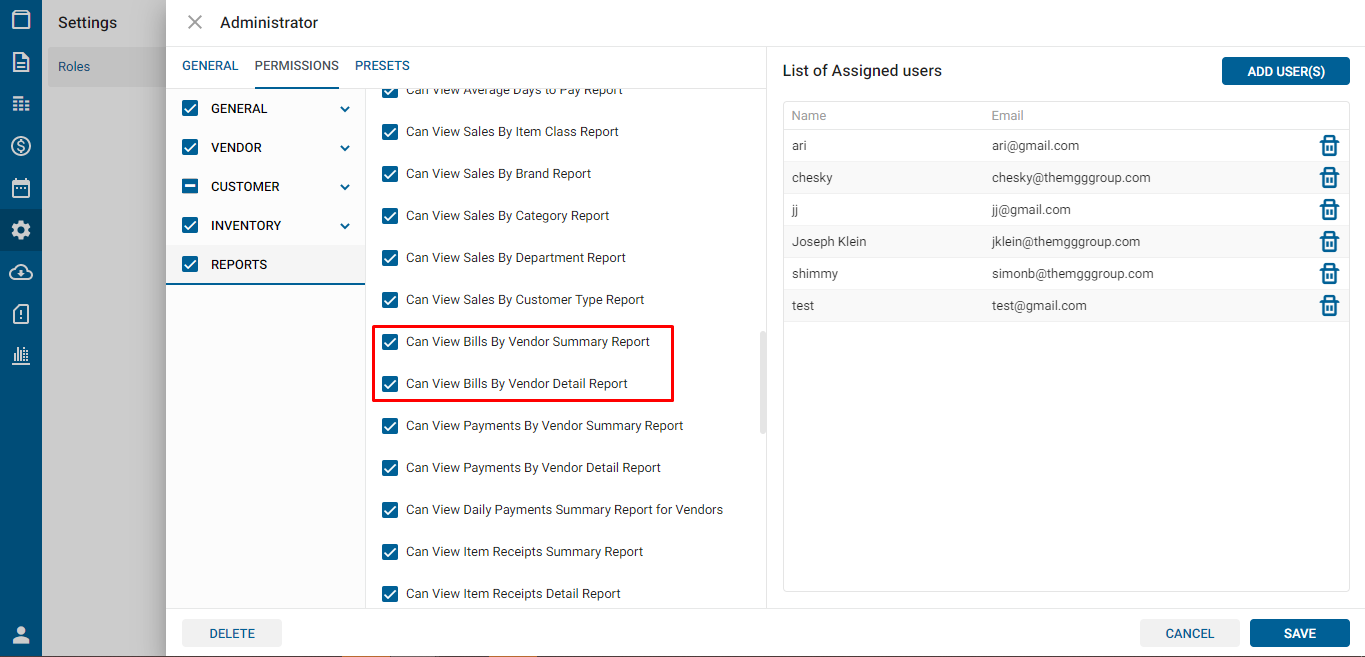 - Can View Bills by Vendor Detail Report: