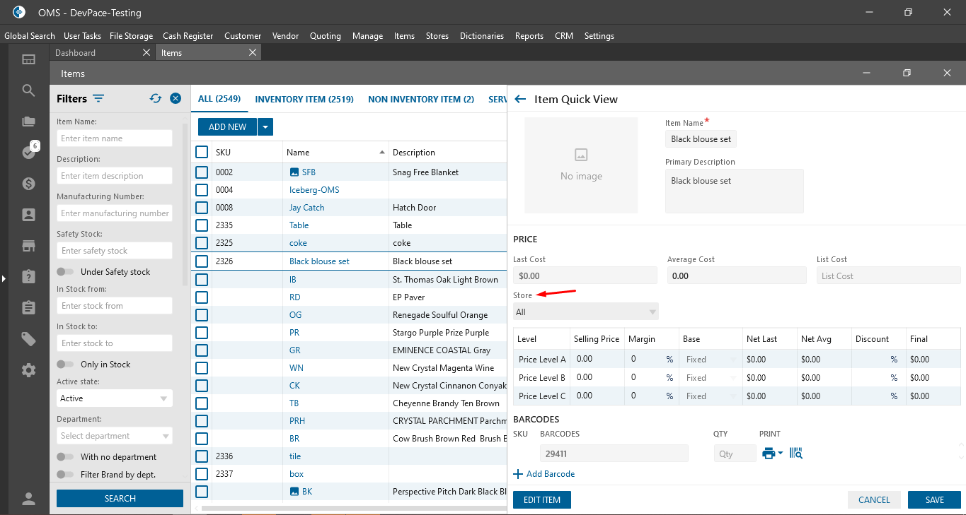 - on the Item Quick view form isn’t selected User default Store Price Levels;