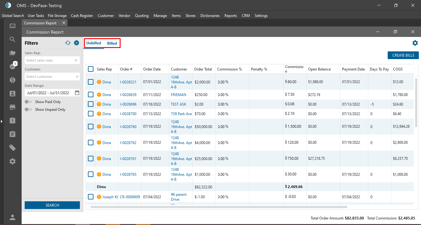 - once Bill has been saved it’s linked to Invoice/Customer credit and Invoice/Customer credit is moved to Billed Commission bucket (on Report from) even if user make Amount in Bill greater or less than Commission.