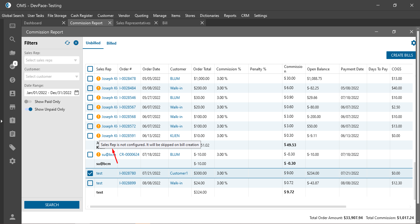 - if user doesn’t have linked Sales Rep -> the tooltip is displayed: “Sales Rep is not configured. It will be skipped on bill creation”;