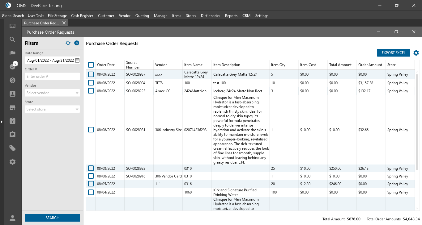 - In the Datagrid are displayed Purchase Order Requests;