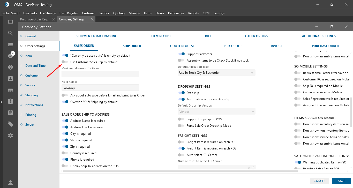 - was added to the “Sales Order” tab -> at the bottom of the “Sale Order Settings” block;