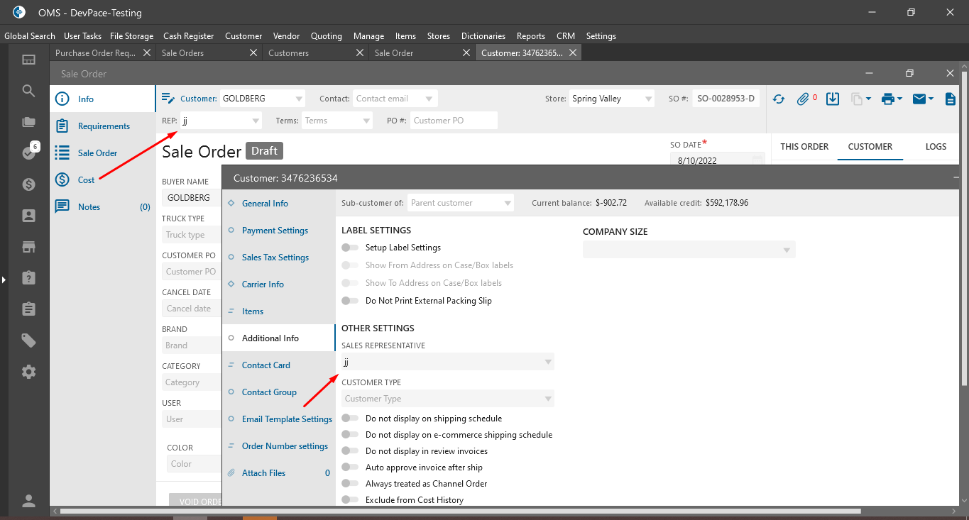 - the Sales Rep from Customer, not from the default Store is displayed.