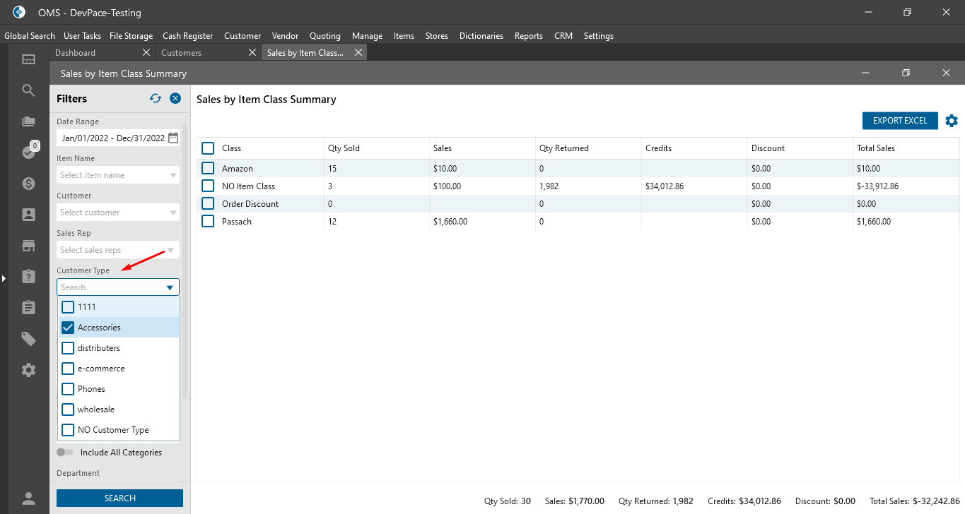 - in the Report Datagrid is displayed data according to the selected Customer type.