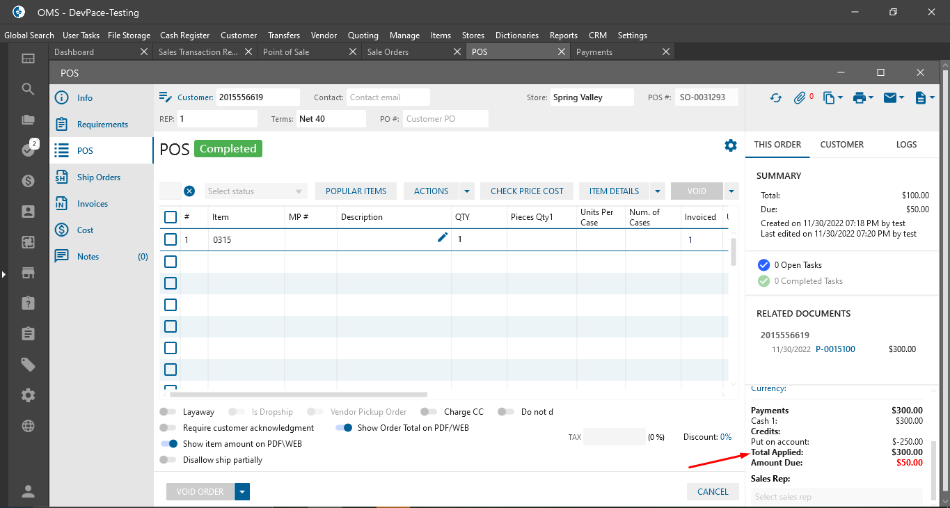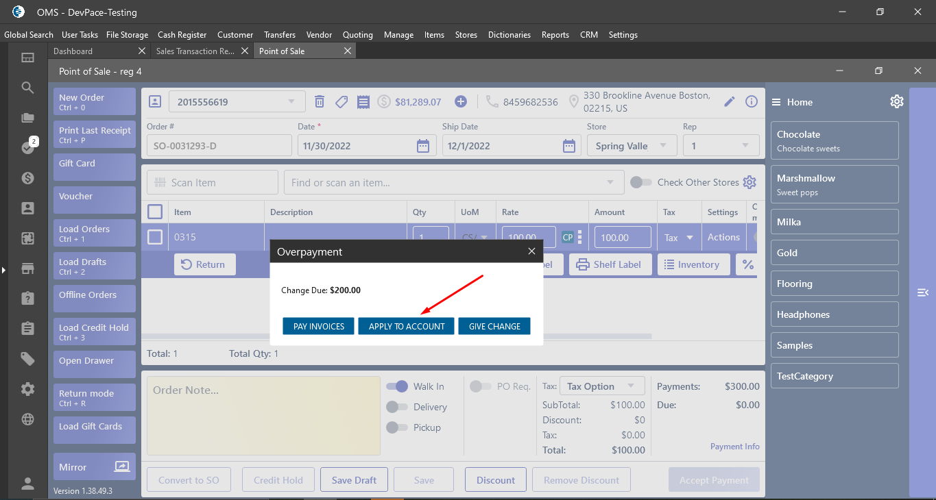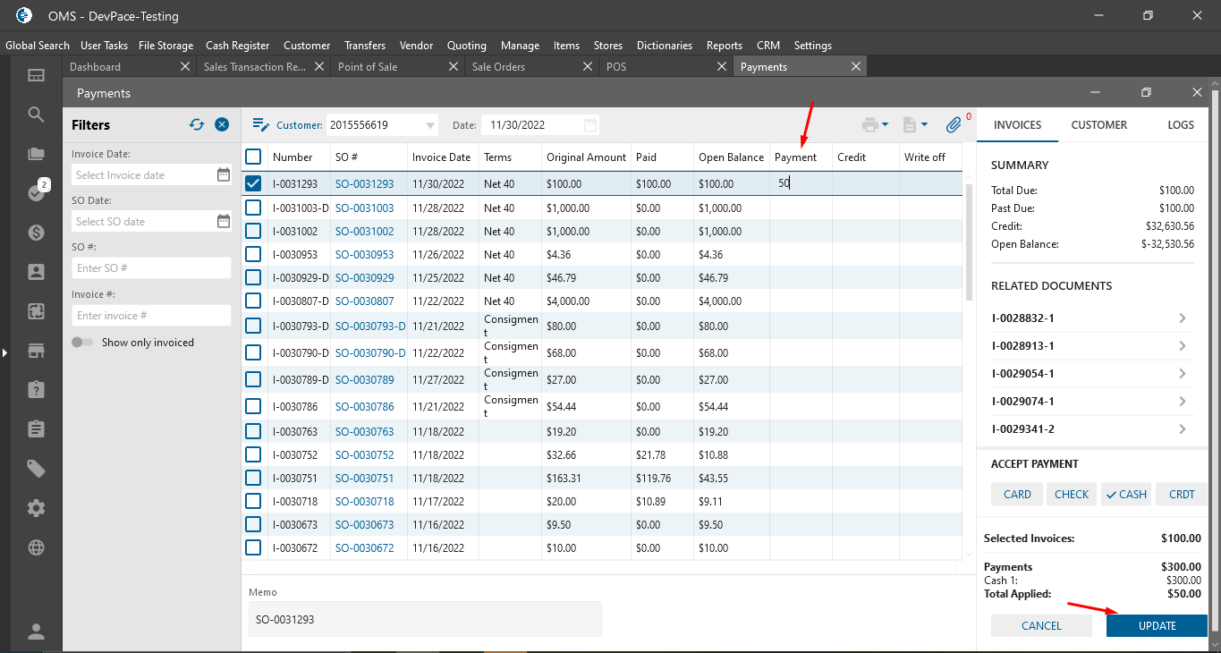 - Add Cash Payment $300 -> Accept -> In displayed pop-up select “Apply to Account”;