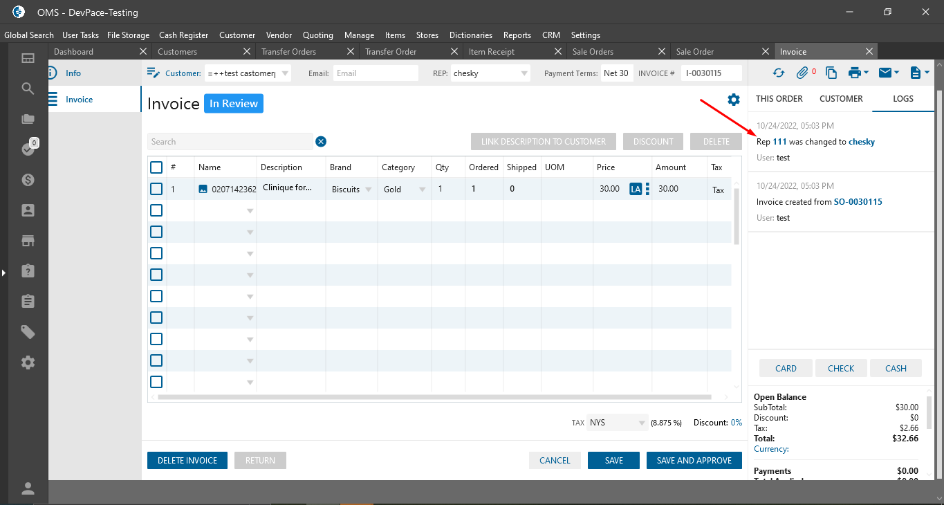If “Sales Rep” has been changed on SO/Invoice/Customer Credit -> once order has been saved -> Logs are added:
