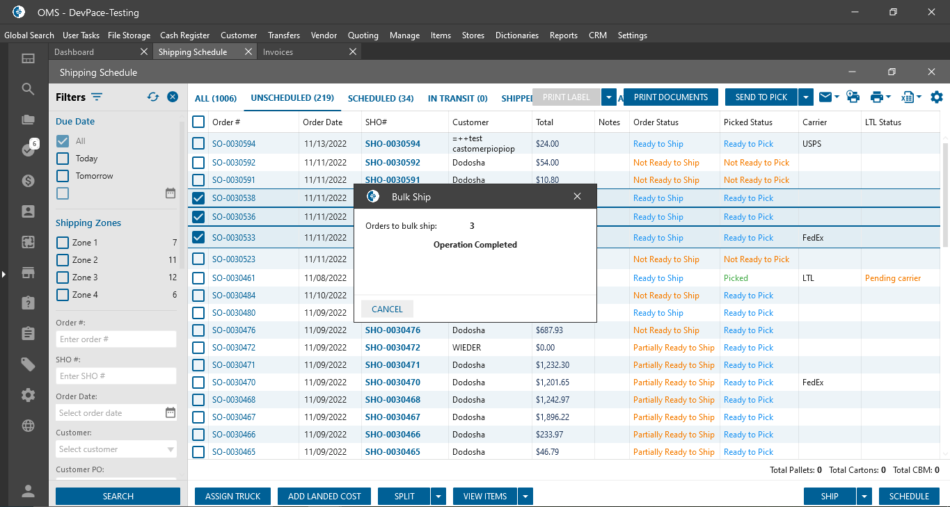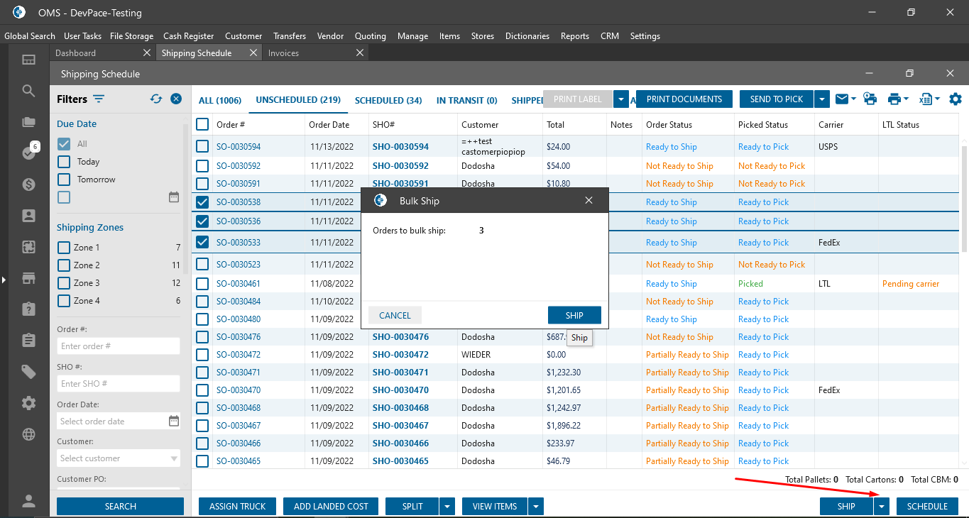 - after clicking on the Bulk Ship button -> is opened the Bulk Ship pop-up: