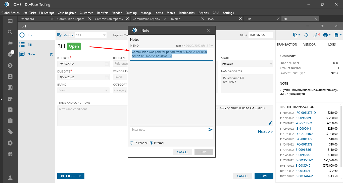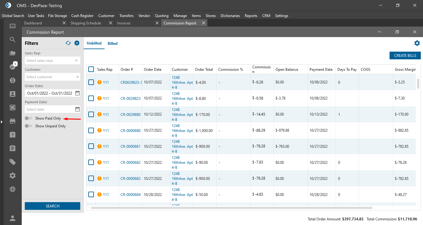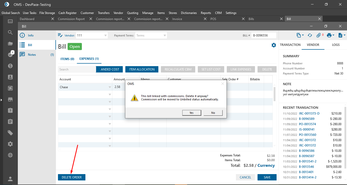 - if Bill was created from the commission report -> after clicking on the “Delete Order” button -> the message “This bill linked with commissions. Delete it anyway? Commission will be moved to Unbilled status automatically” is displayed;