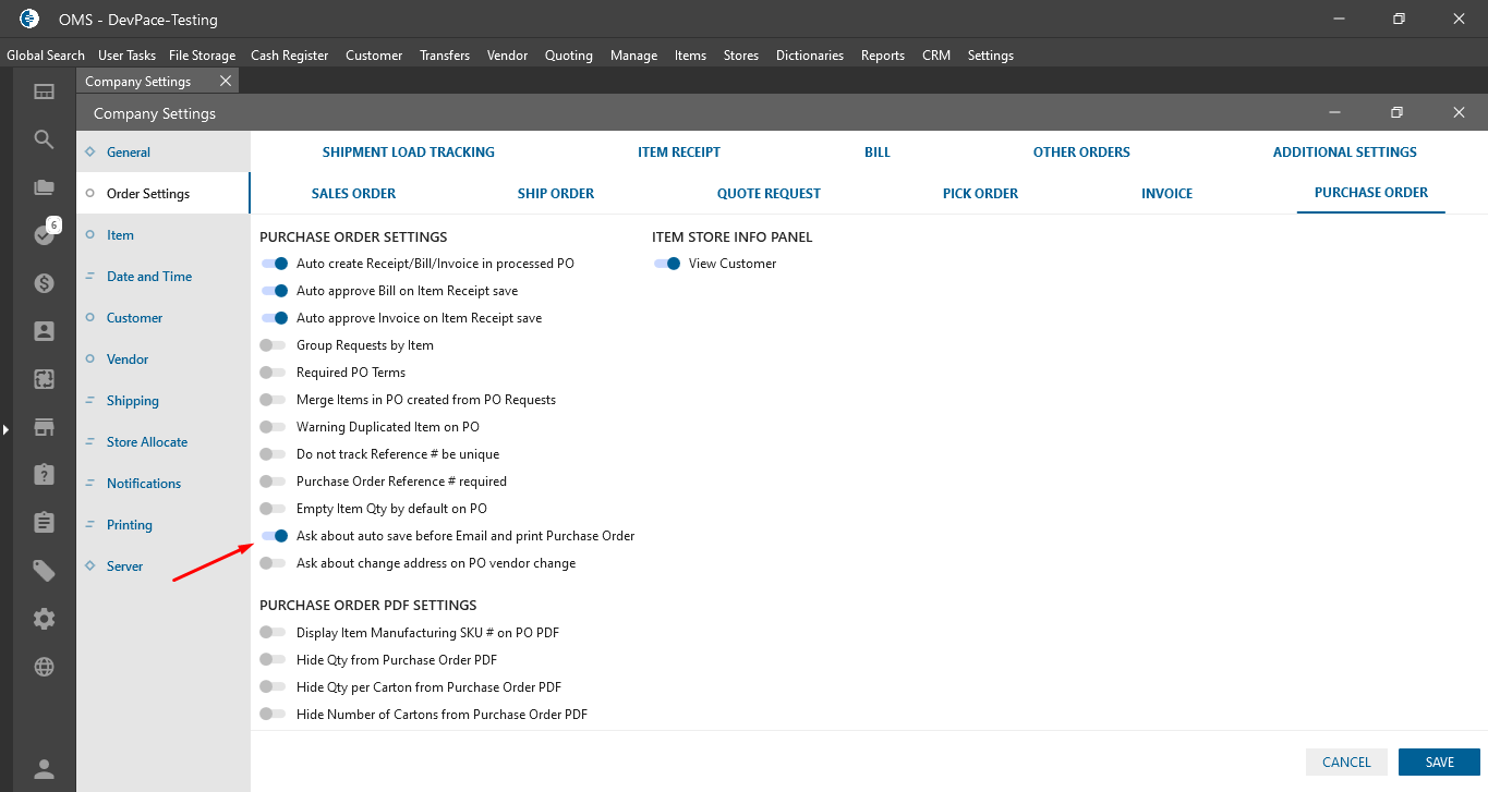 - “Ask about auto save before email and print Purchase Order” checkbox: