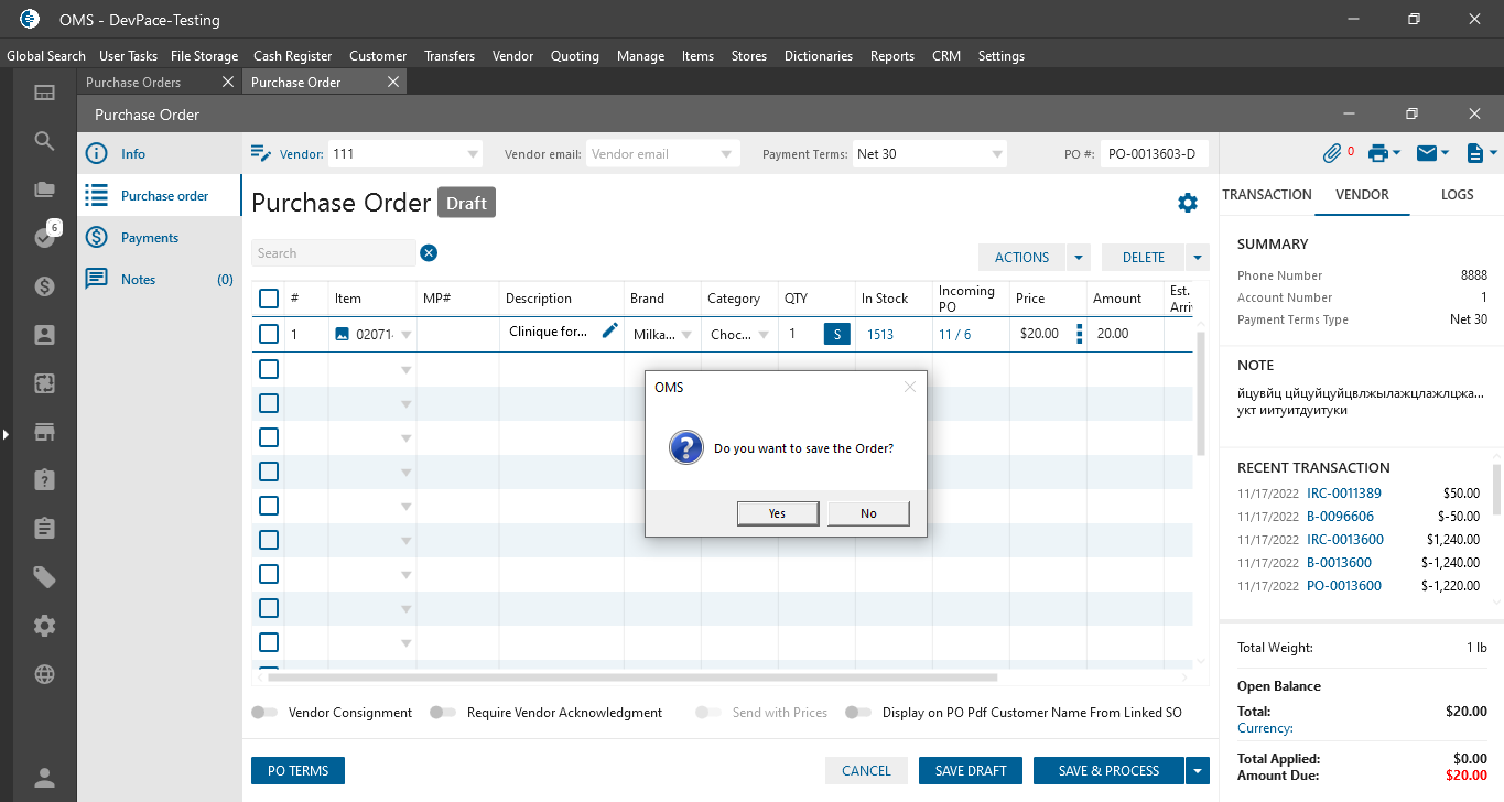 - if the Purchase Order was changed -> after clicking on the “Print” / Email / Create PDF buttons -> the OMS message is displayed: