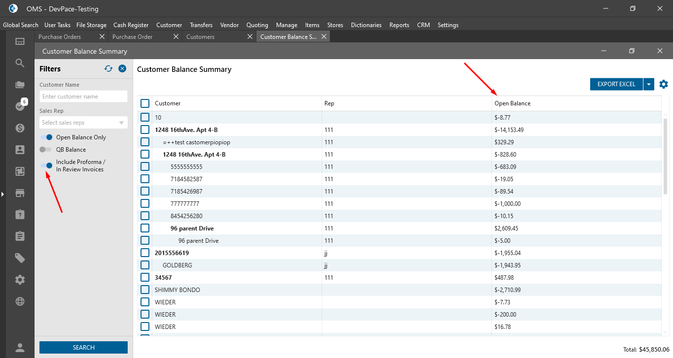 - in the “Open Balance” column are calculated Invoices in “Proforma” / “In Review” statuses.