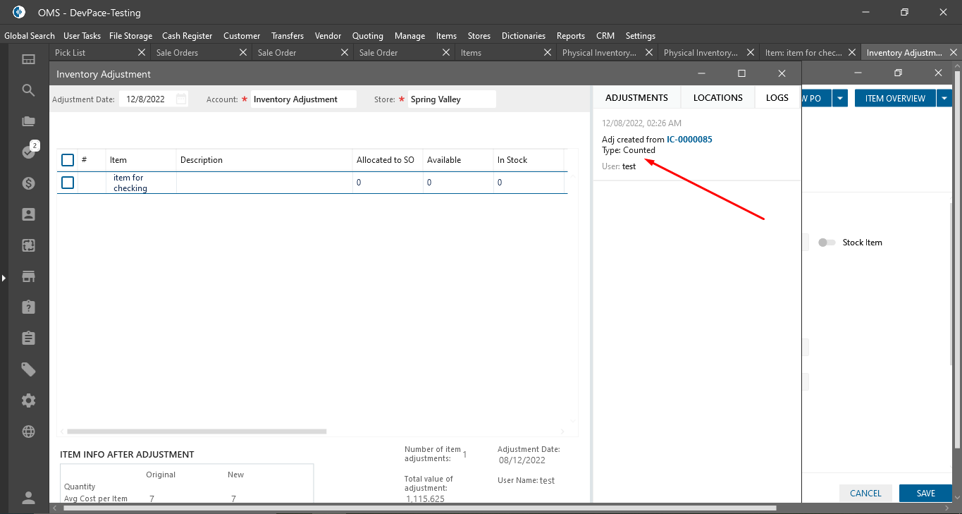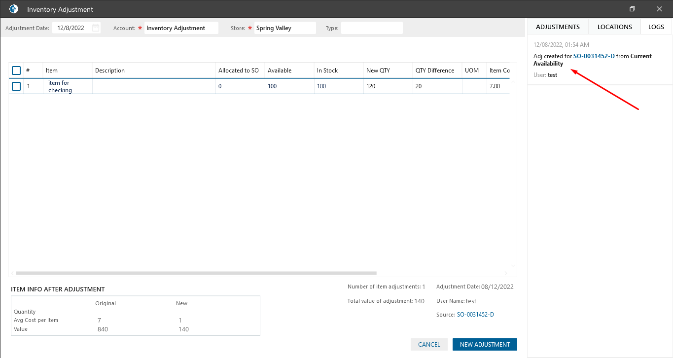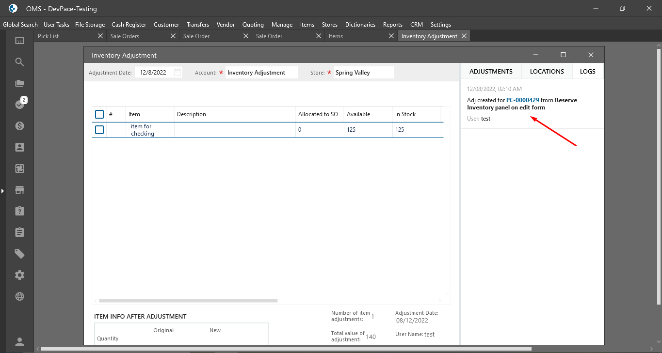 - if Inv Adj was created from Pick edit form -> Reserve Inventory Panel: