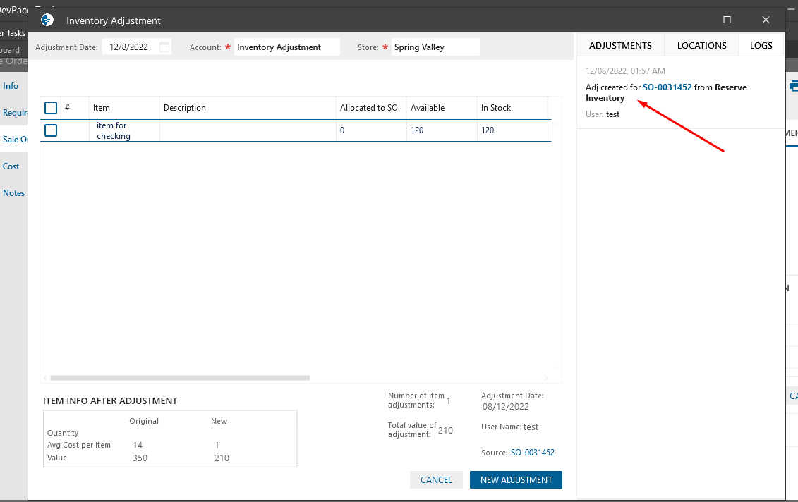 - Text: Adj created for SO- XXX from Reserve Inventory;