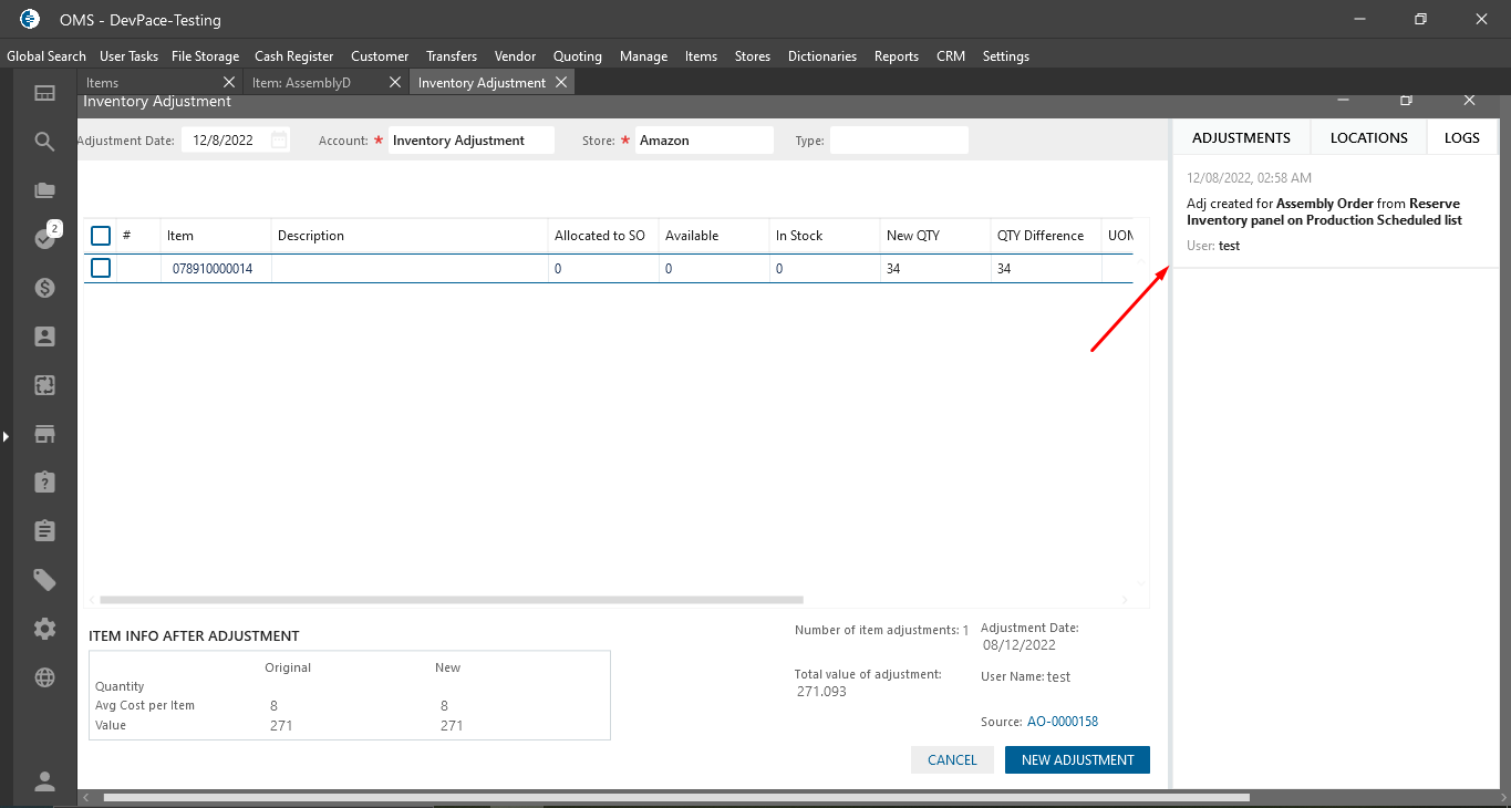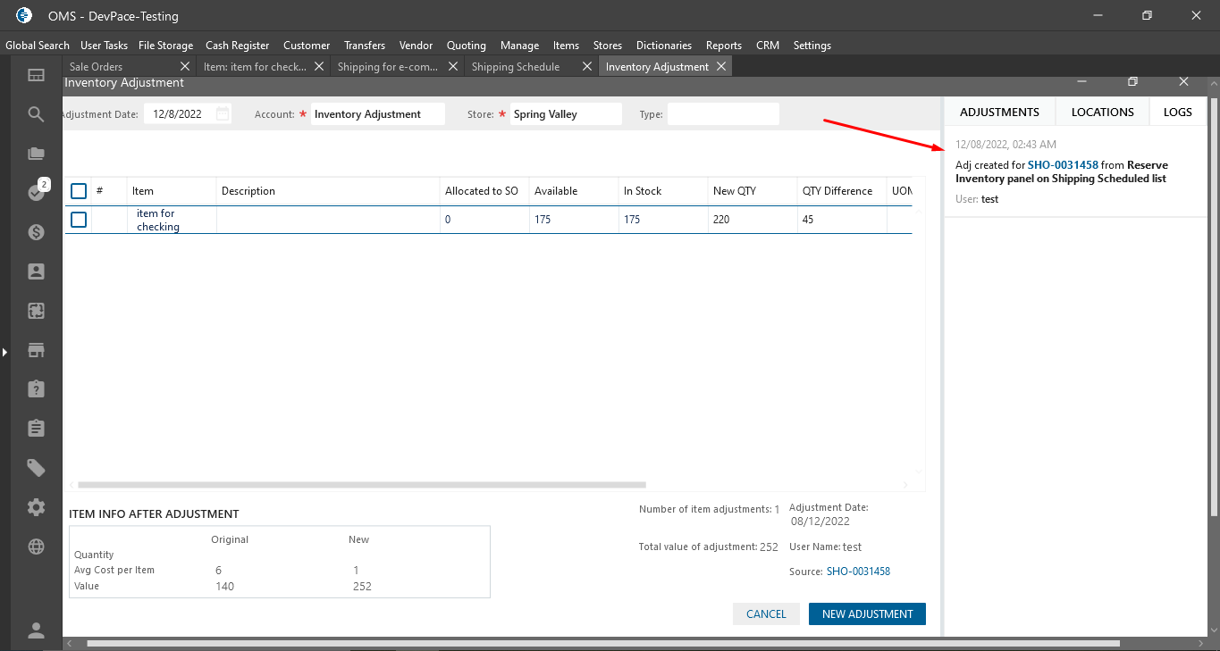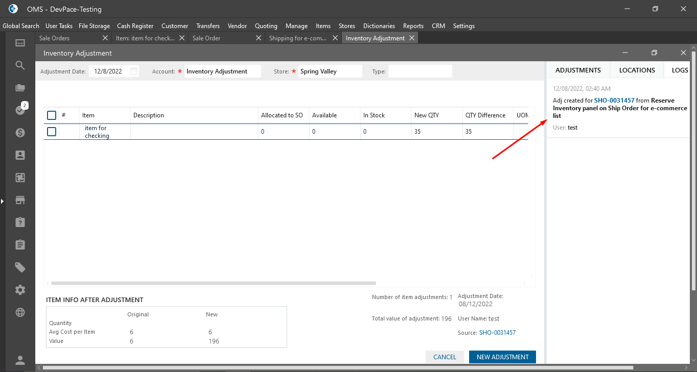 - Text: Adj created for SHO-XXX from “Reserve Inventory” panel on Ship Order for e-commerce list;