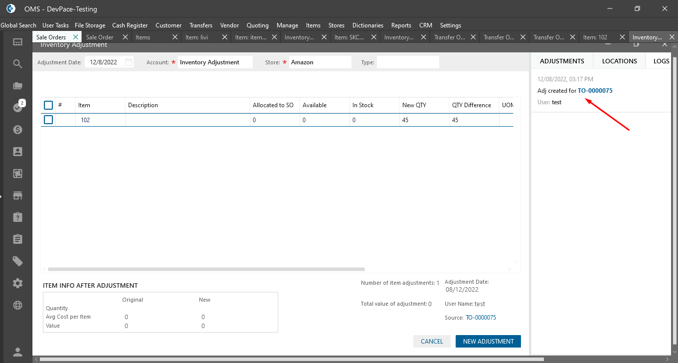 - If Inv Adj was created from TO list form → Reserve Inventory panel: