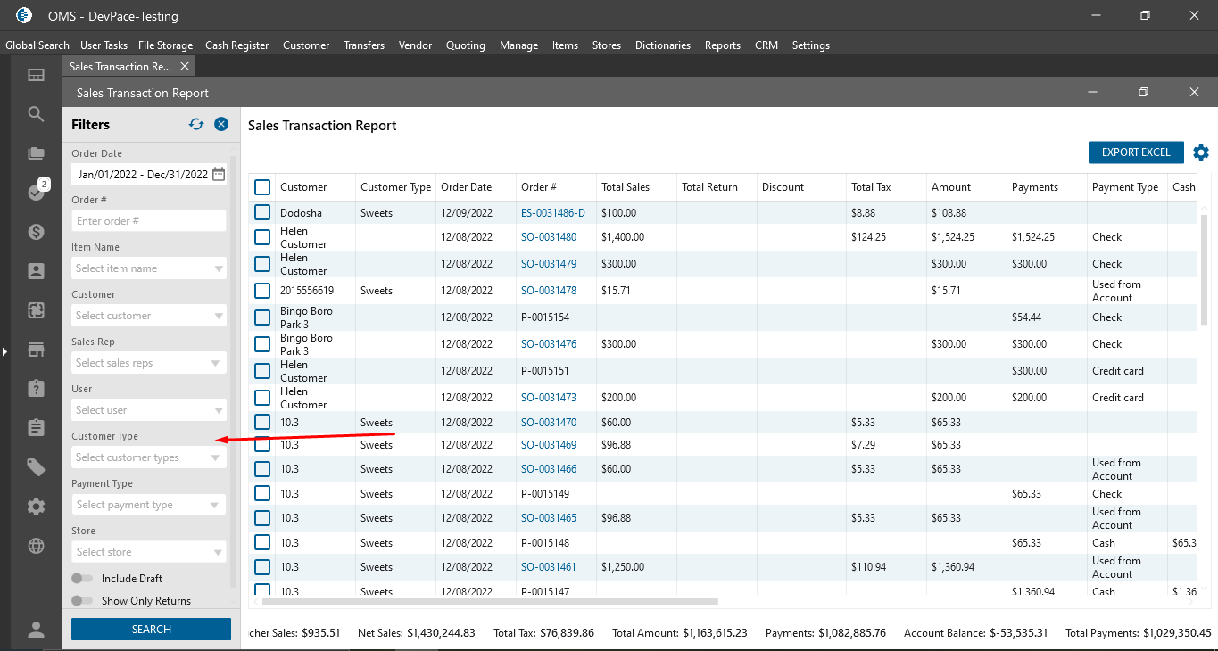 Sales transaction report -> Filter panel: