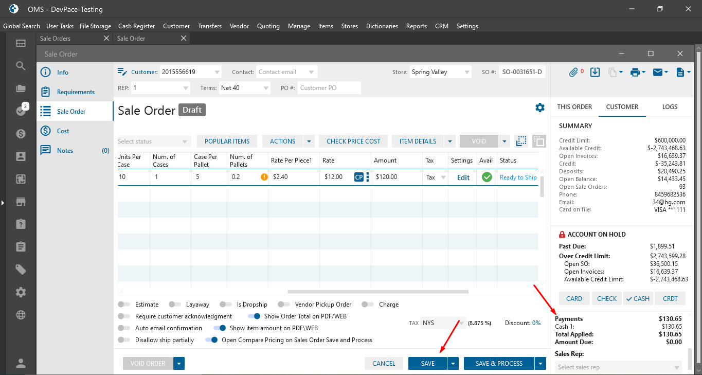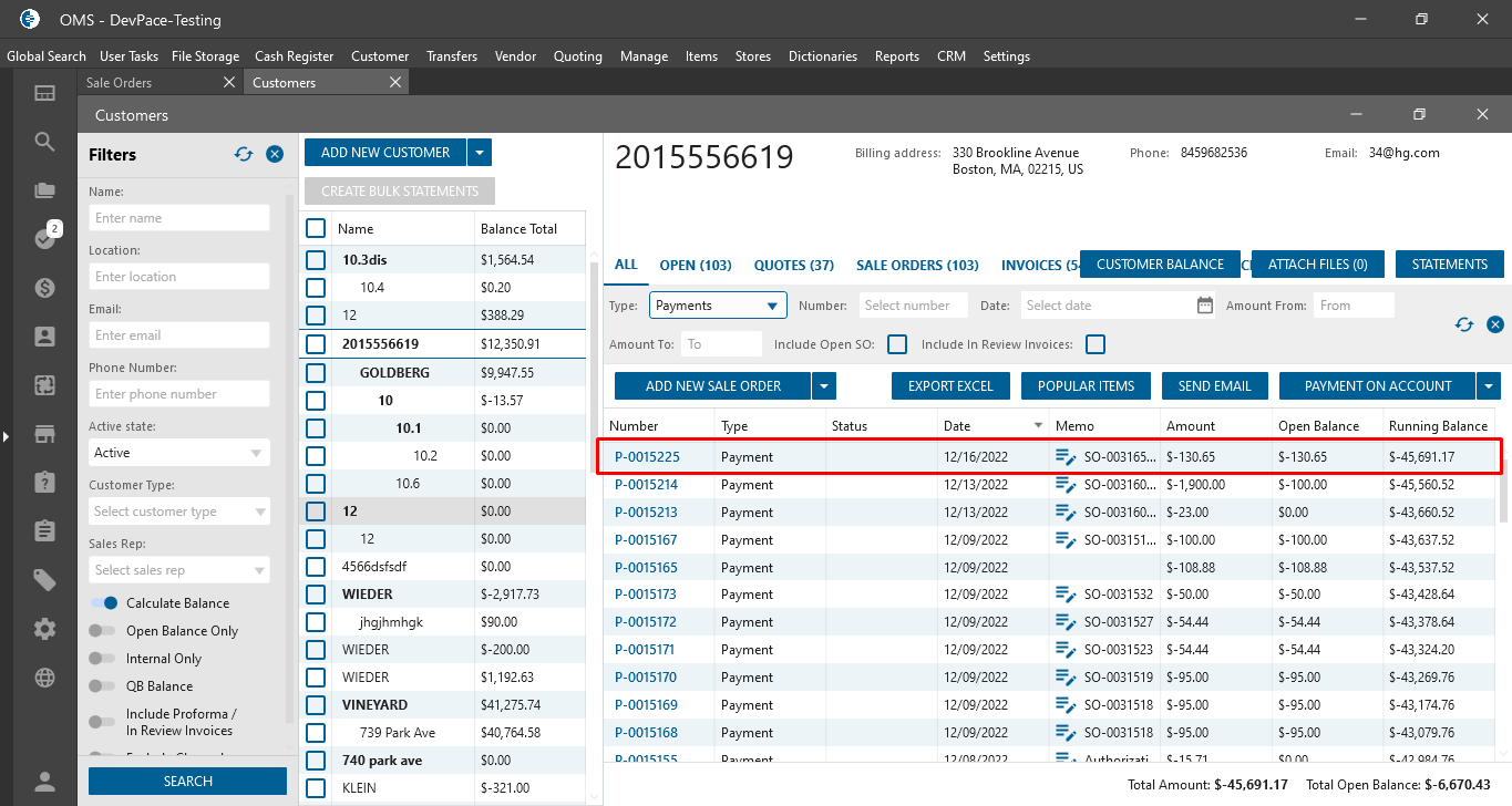 Payment is present at the customer center after deleting the Sale Order draft. The open balance is recalculated. Customer transactions are also created for draft SO.