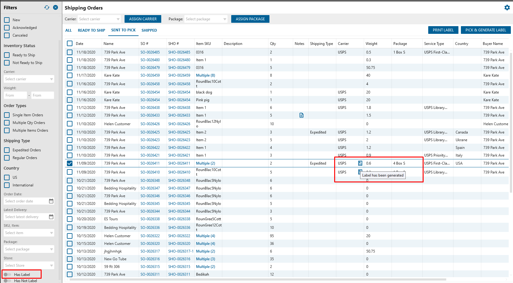 If for the SHO order has been generated label then the icon will be added to the Carrier column on the Shipping Schedule for e-Commerce companies form.