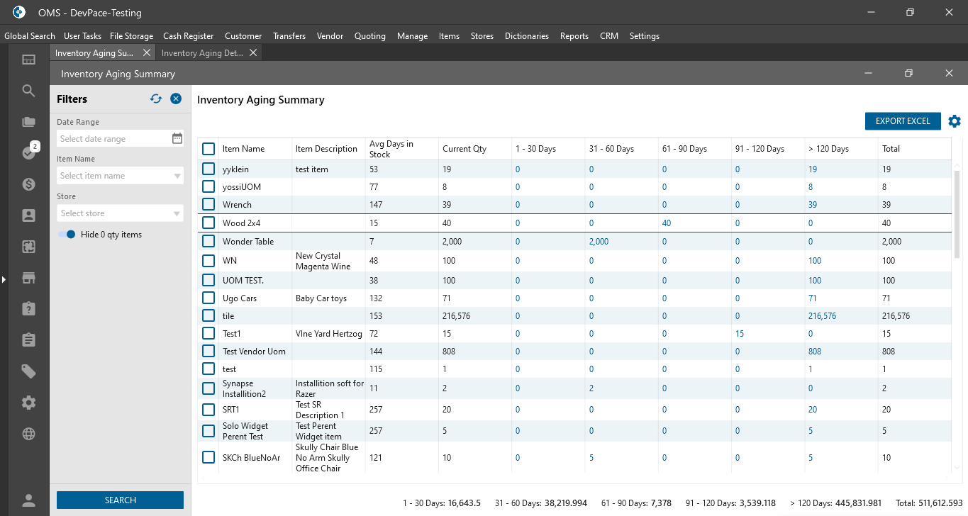 - the value is clickable -> after clicking on the value the “Inventory Aging Detail” Report is opened and filtered by Item/Store/Date Range in 91 – 120;