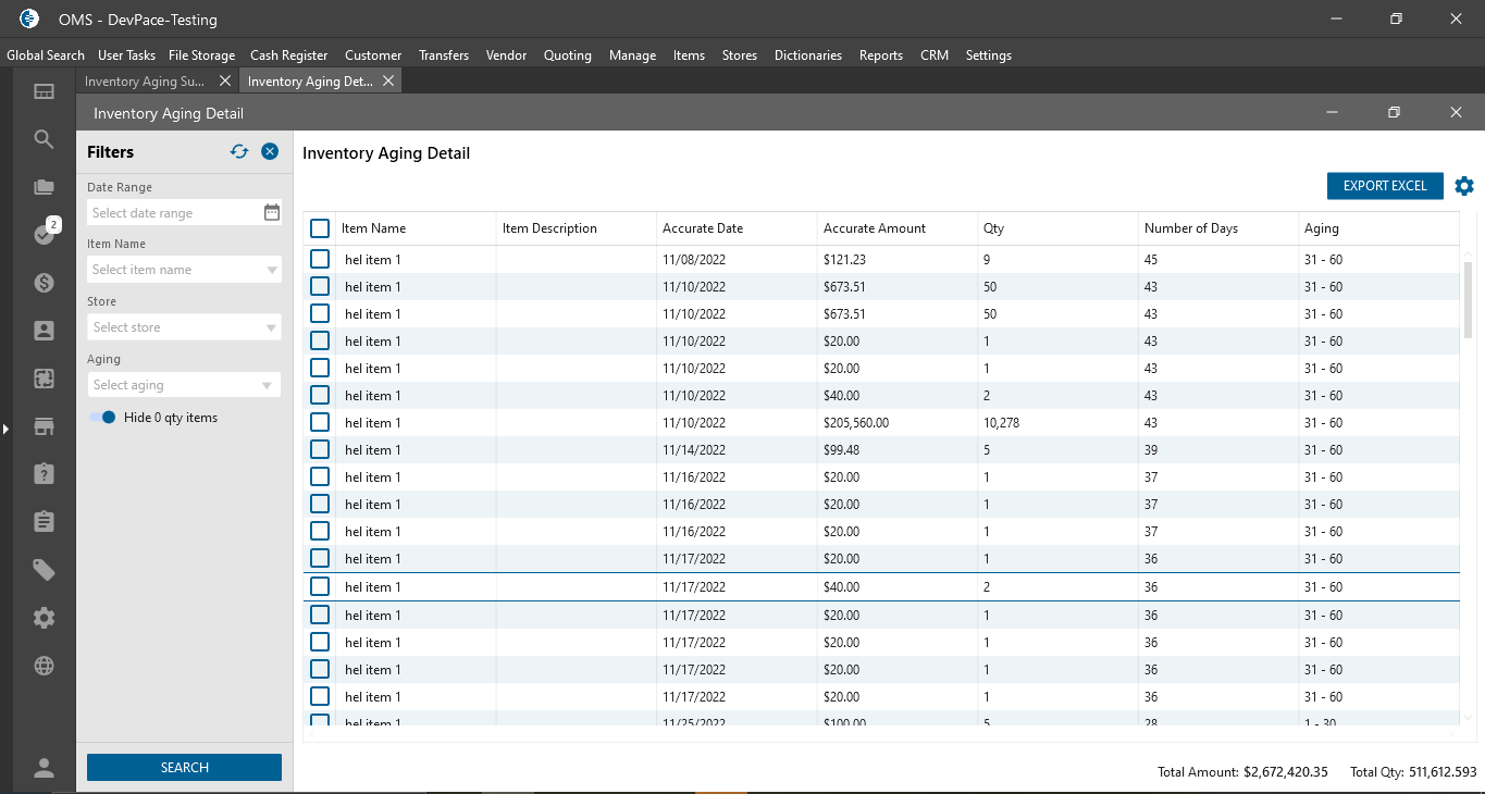 - the value is clickable -> after clicking on the value the “Inventory Aging Detail” Report is opened and filtered by Item/Store/Date Range in 61 – 90;