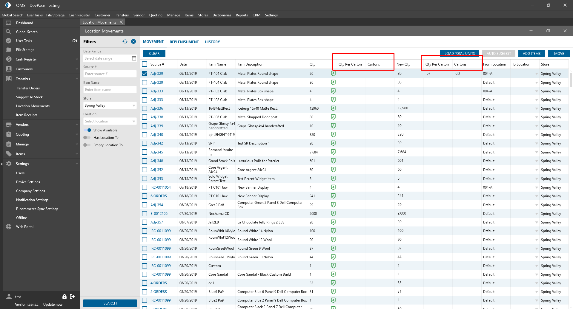 - Movements / Replenishment tabs: