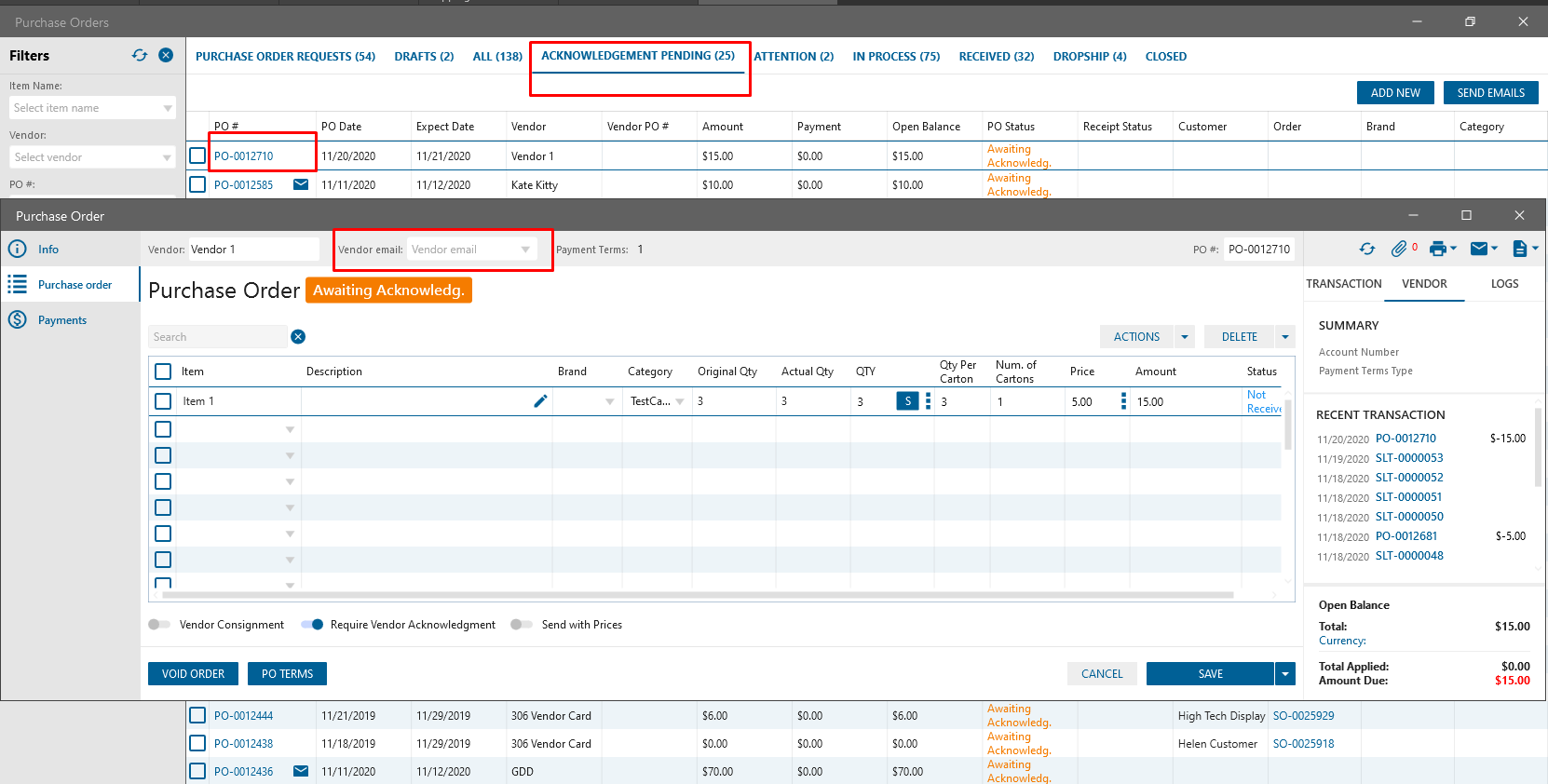 - If on the PO edit form “Require Vendor Acknowledgment” checkbox is set on then the Vendor email field isn’t required