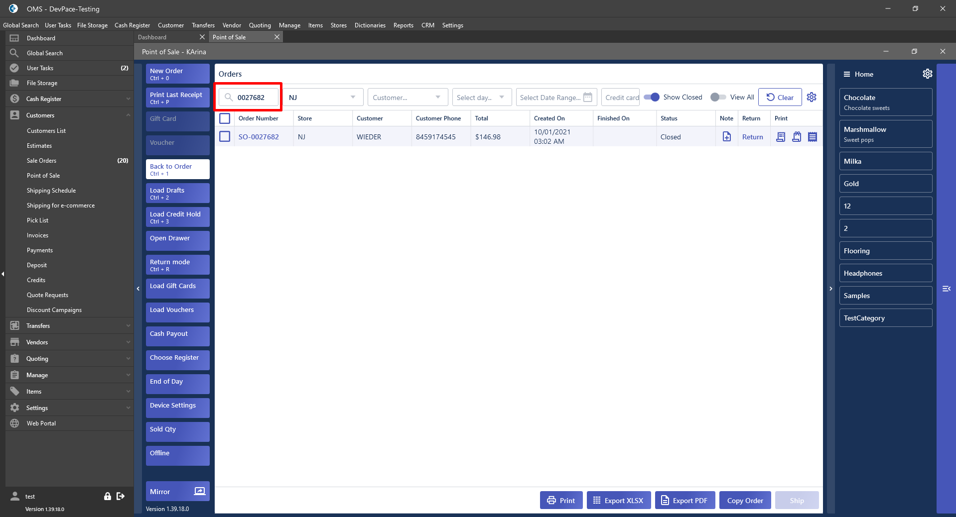 - if the user enters or scanned the full order number into the “Find Order” textbox -> order is found in the system and displayed in the Datagrid.