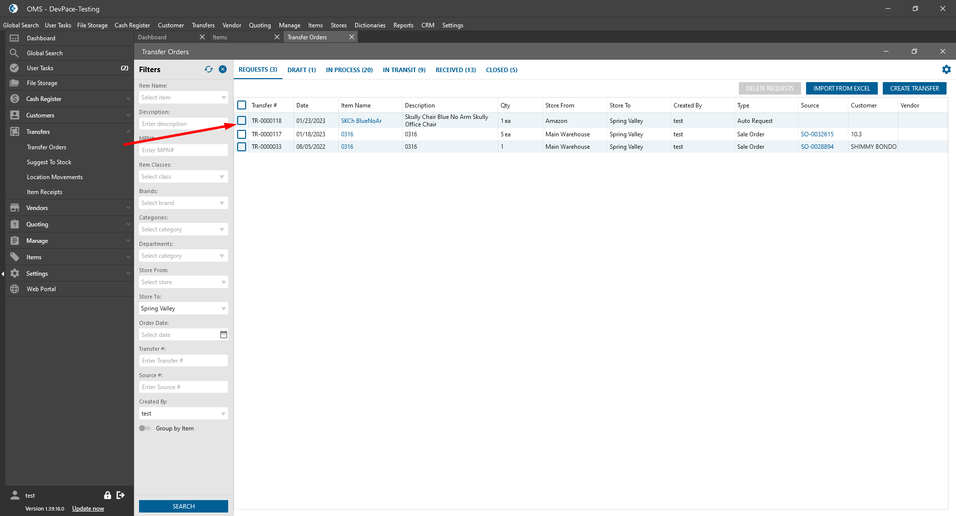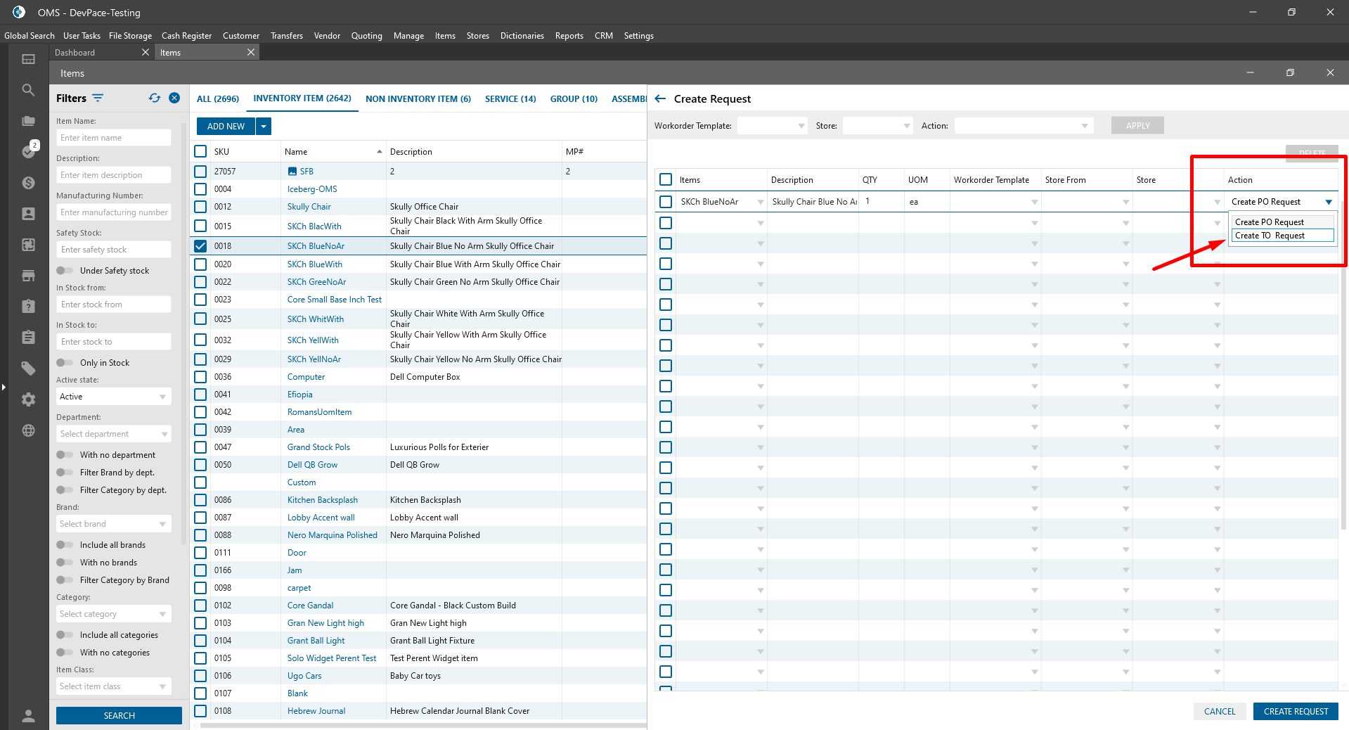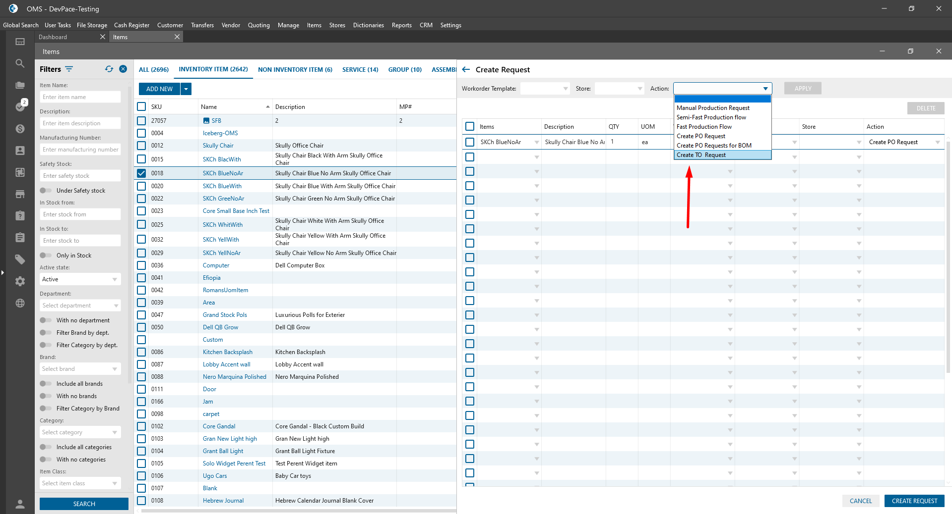 - if the item was added to the Datagrid -> “Create TO Request” is displayed in the “Action” dropdown;