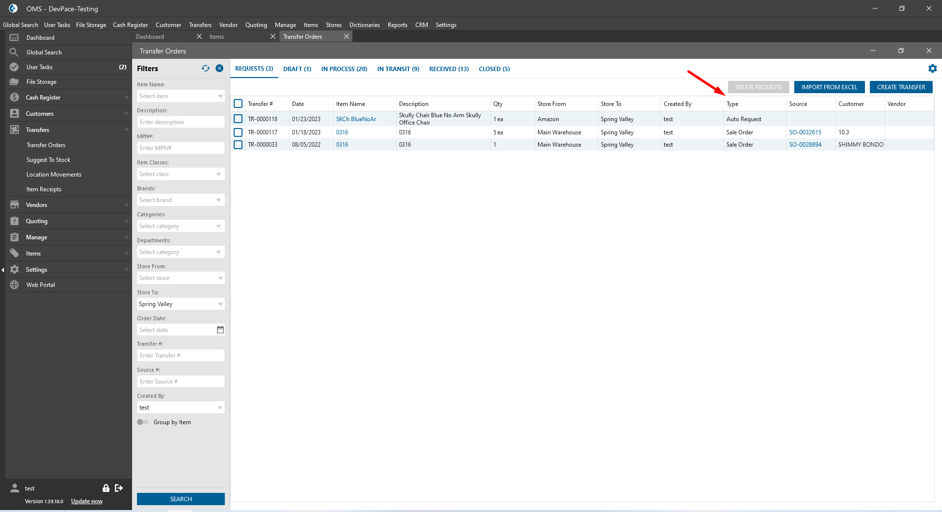 - if in the Dropdown was selected the “Create TO Request” action -> after clicking on the “Apply” button -> Action is prefilled to the selected items in the Datagrid;