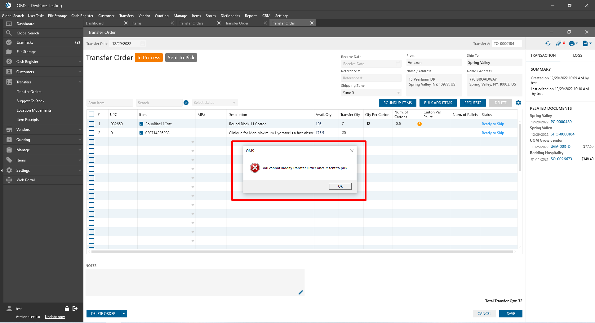 - Text: “You cannot modify Transfer Order once it sent to pick”;