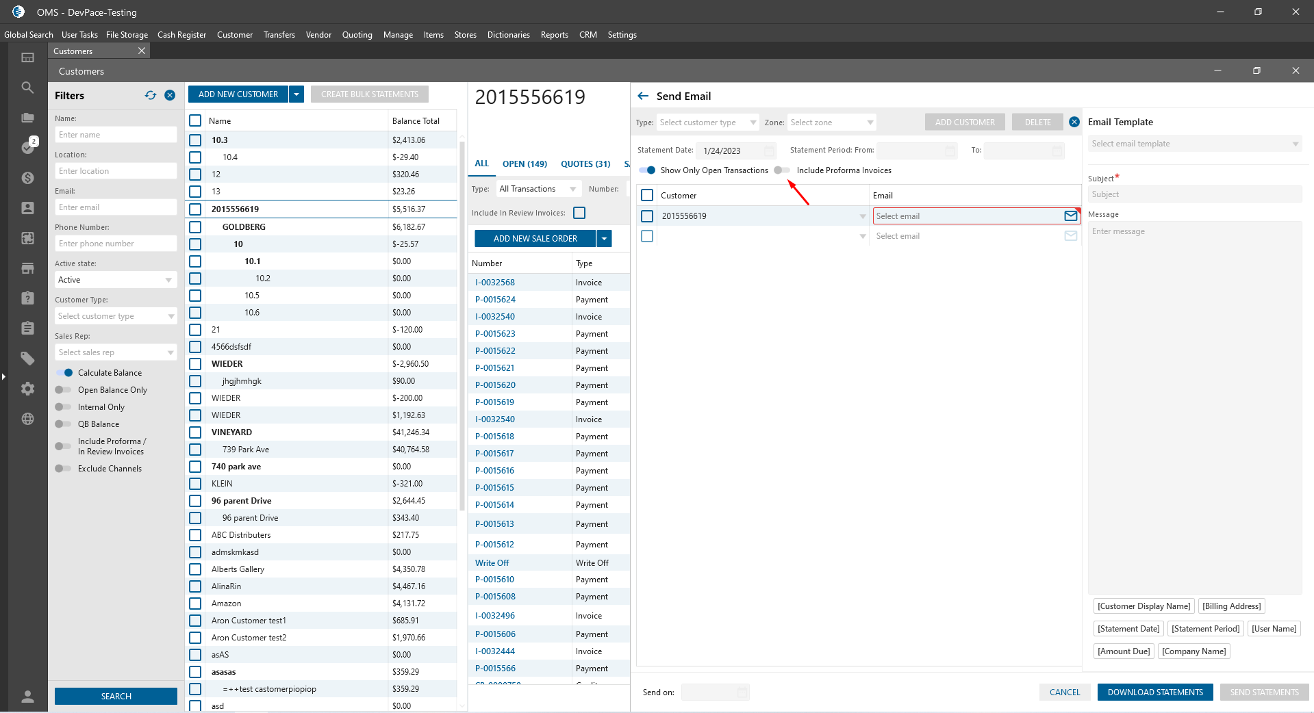 Customer List form -> “Statements” button -> “Send Email” panel: