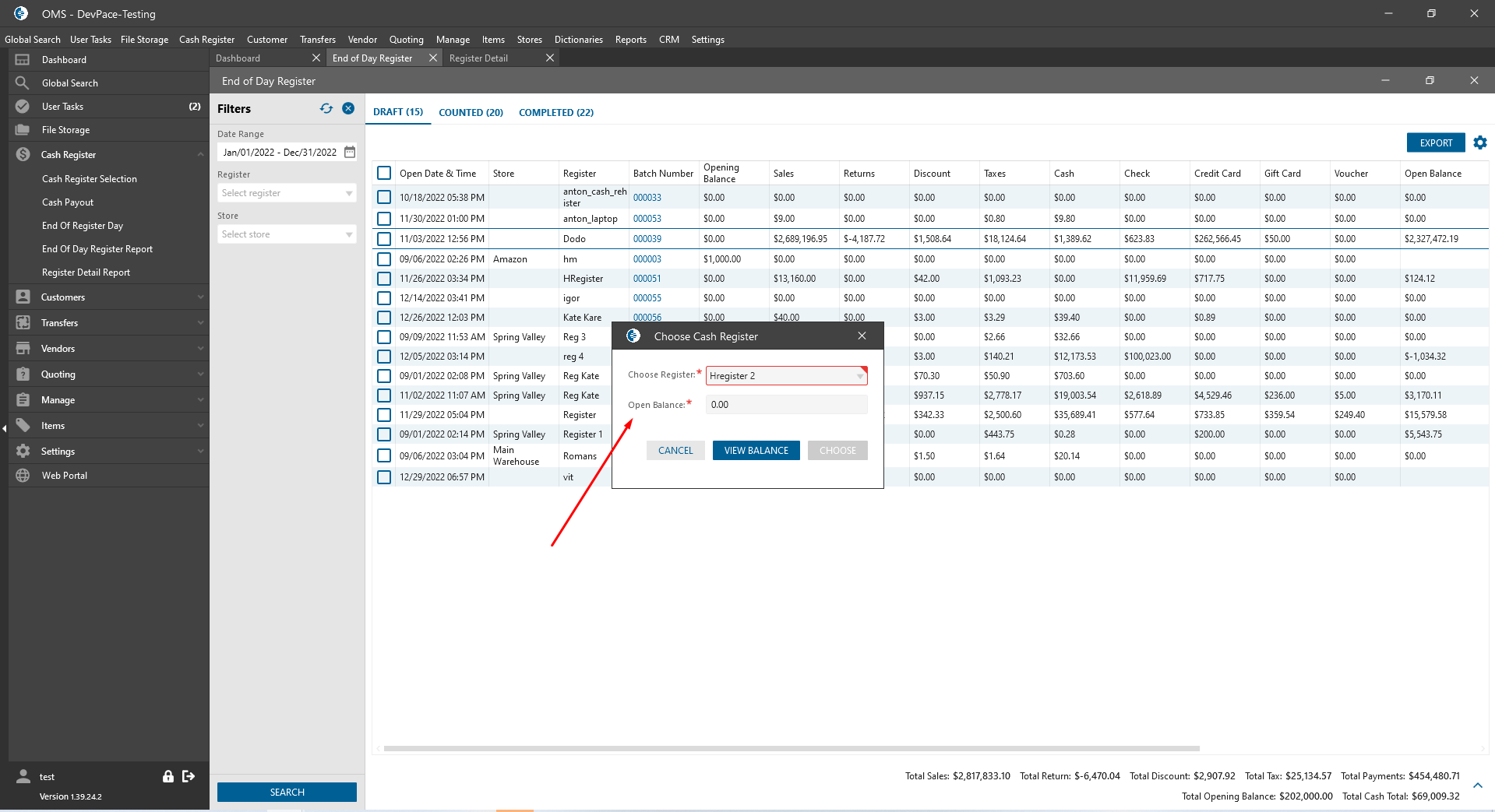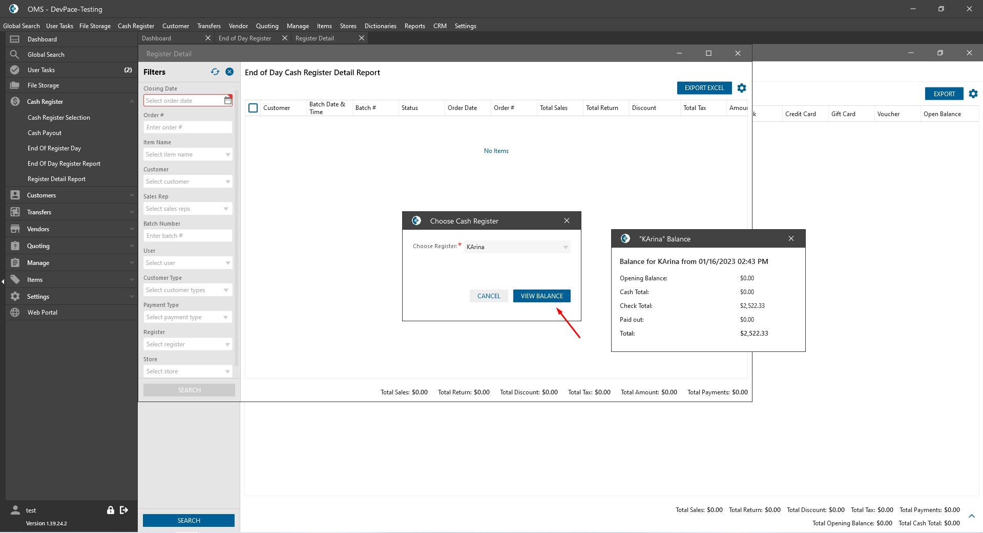 - if a balance has been added it is displayed in the “Open balance” field on the “View Balance” / “Close Register” forms / Choose Cash Register;