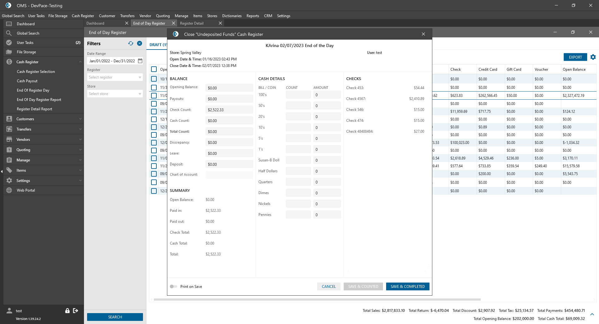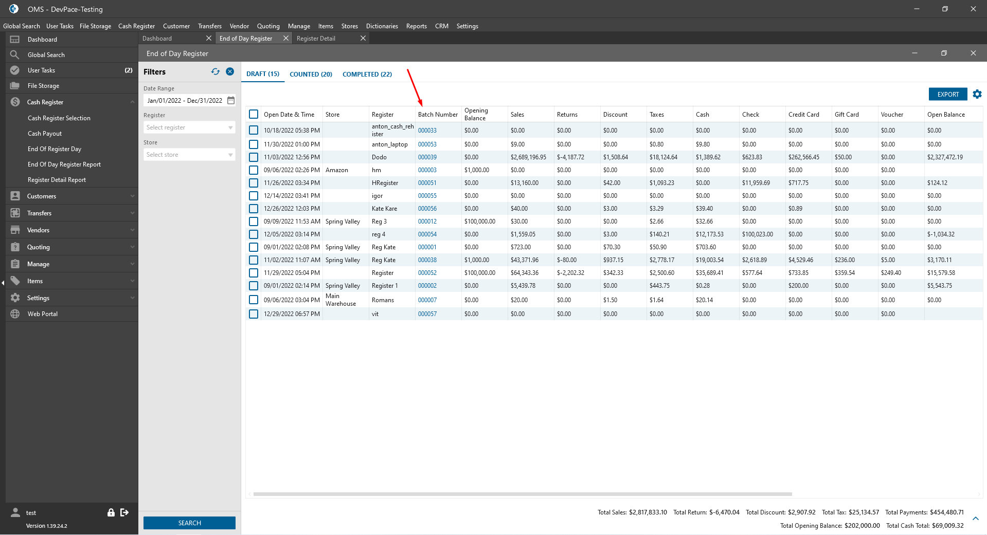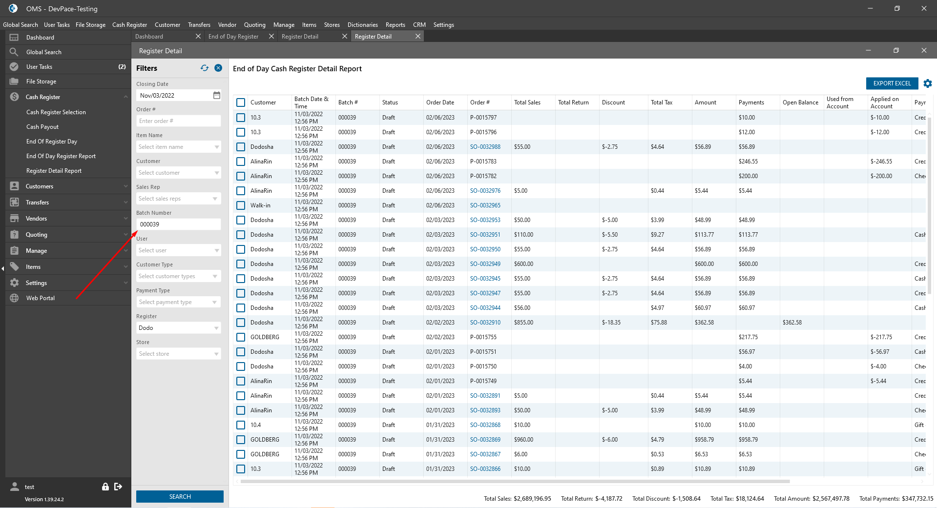 - if the user double clicks on the row in the “End of Day Cash Register Detail” Report -> the batch # is prefilled automatically.