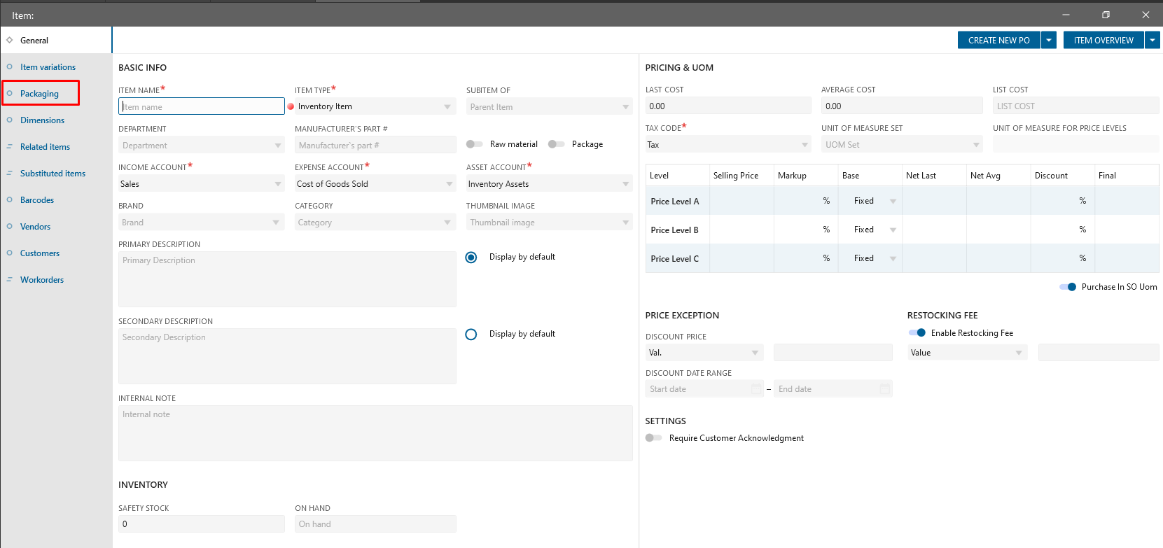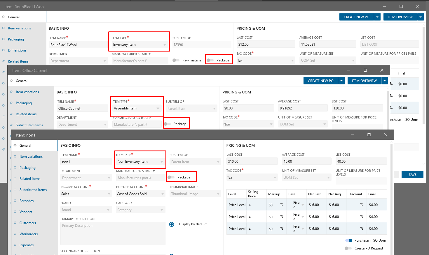 Package checkbox should be displayed only for inventory/non inventory/assembly items