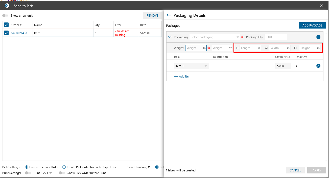Required validation should be removed on the Send to pick form for package: Length/width/height
