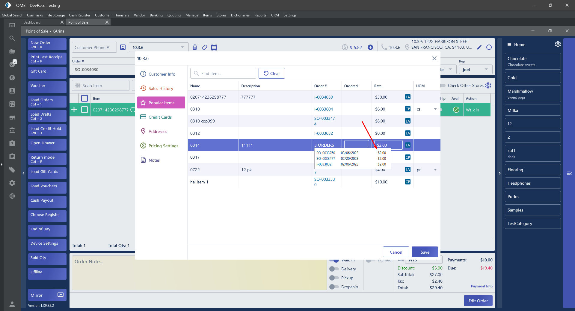 The Pop-over on the Popular Items for POS