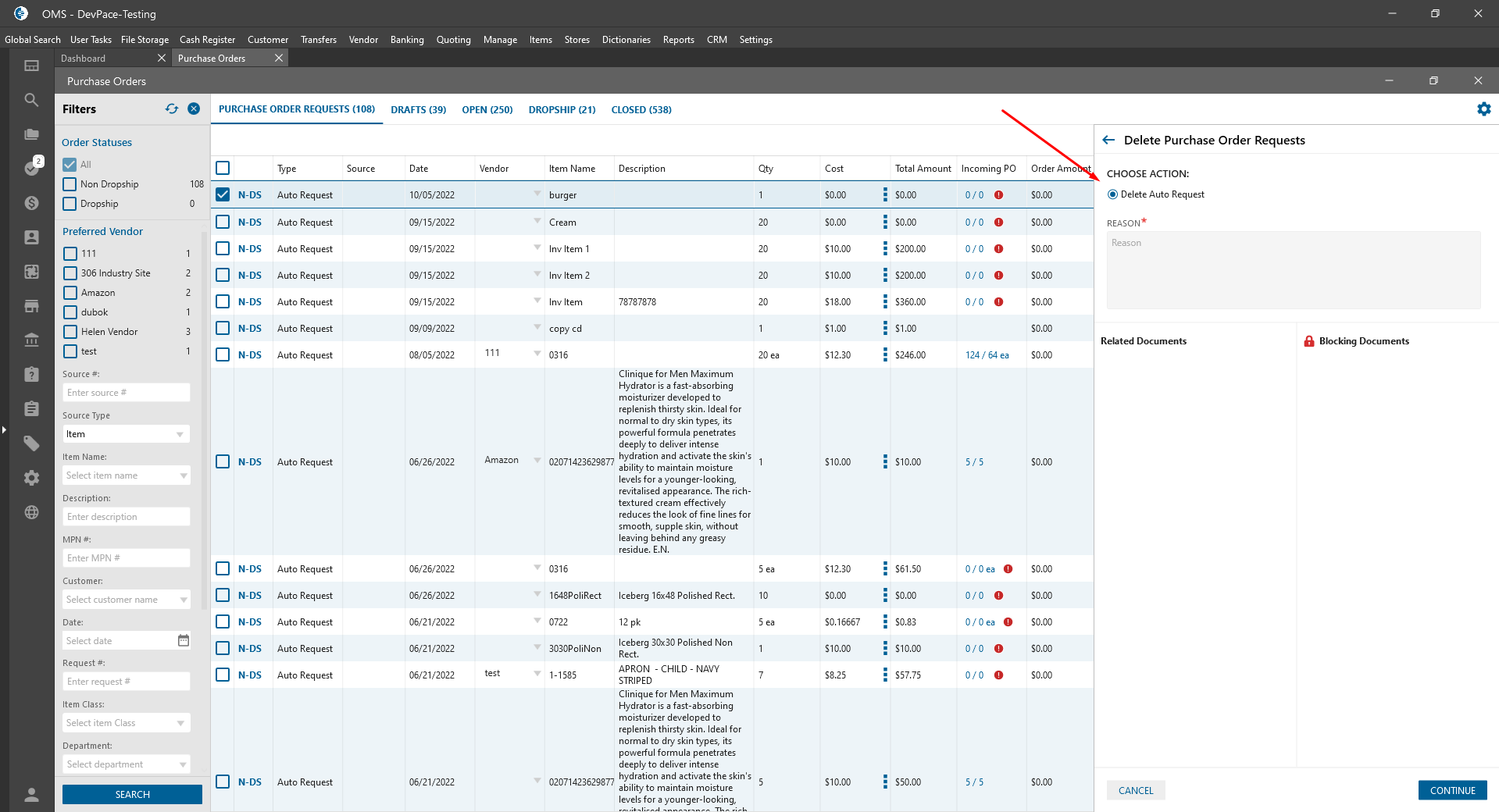 - Observe the action button on the “Delete Purchase Order Requests” panel.