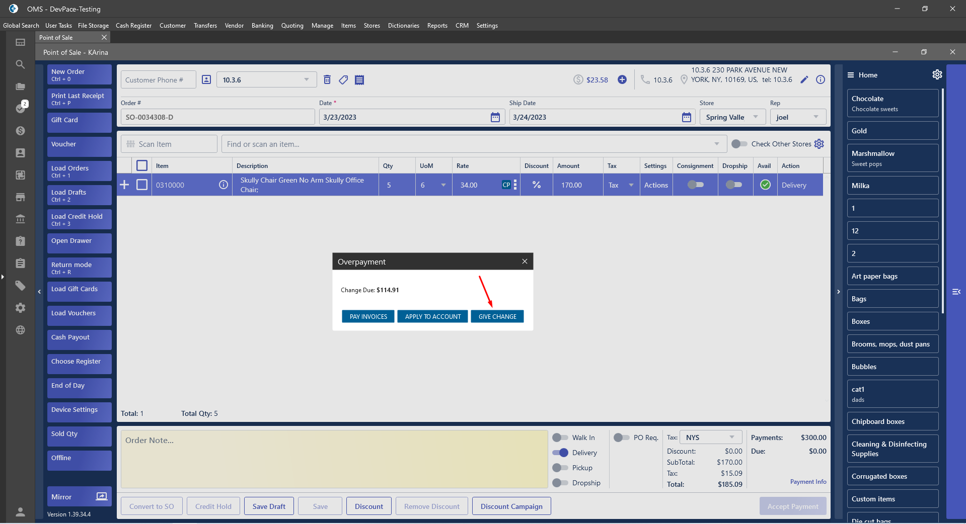 The “Give change” action button is presented at the overpayment option pop-up after applying for payment by cash or check.
