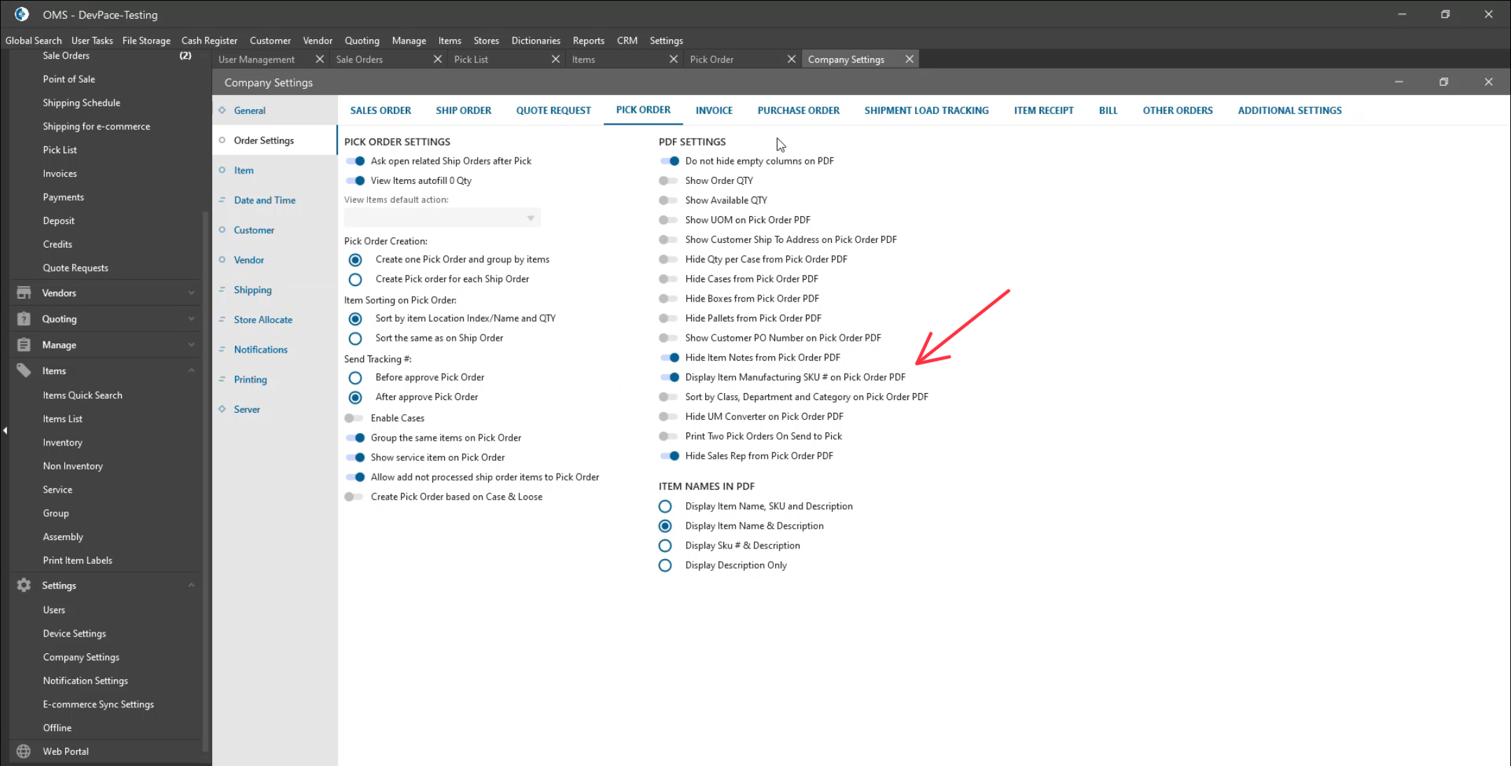 - if the “Display Item Manufacturing SKU# on Pick Order PDF” checkbox in the Company Settings is checked -> the column is displayed;