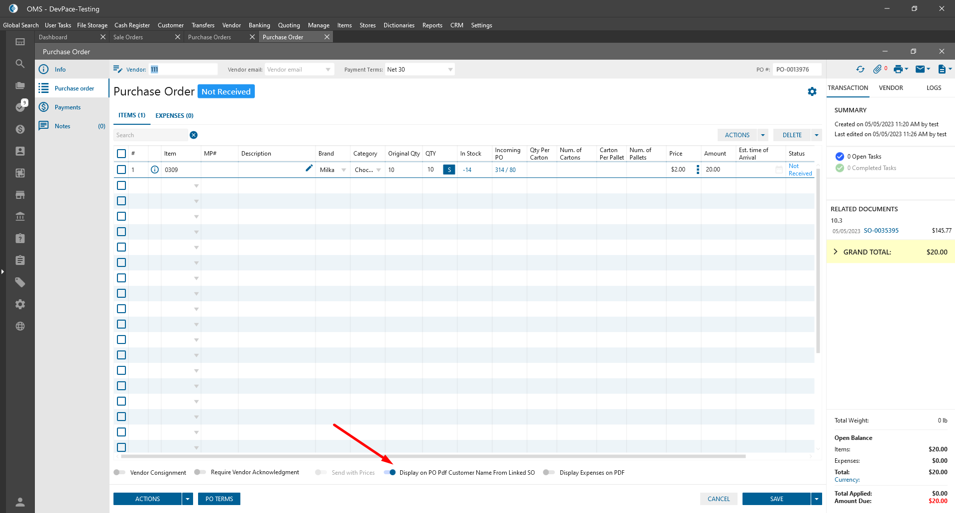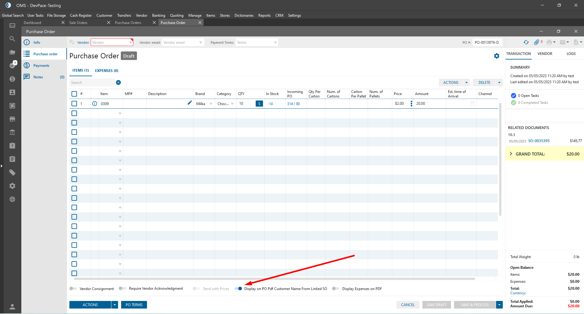 - Open POR list -> create PO from request -> Turn ON “Display on PO PDF Customer Name from Linked SO” setting -> save;