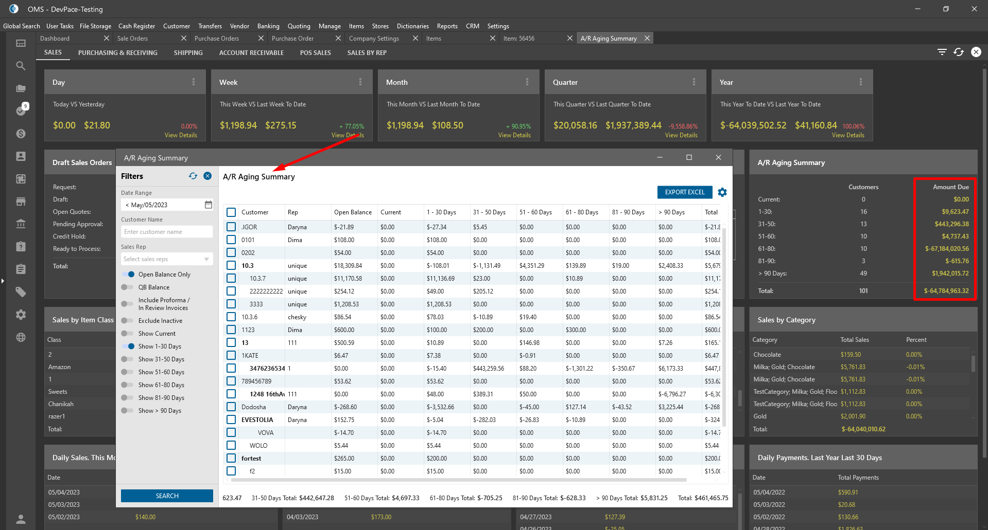 - Open Dashboard -> A/R aging summary report;