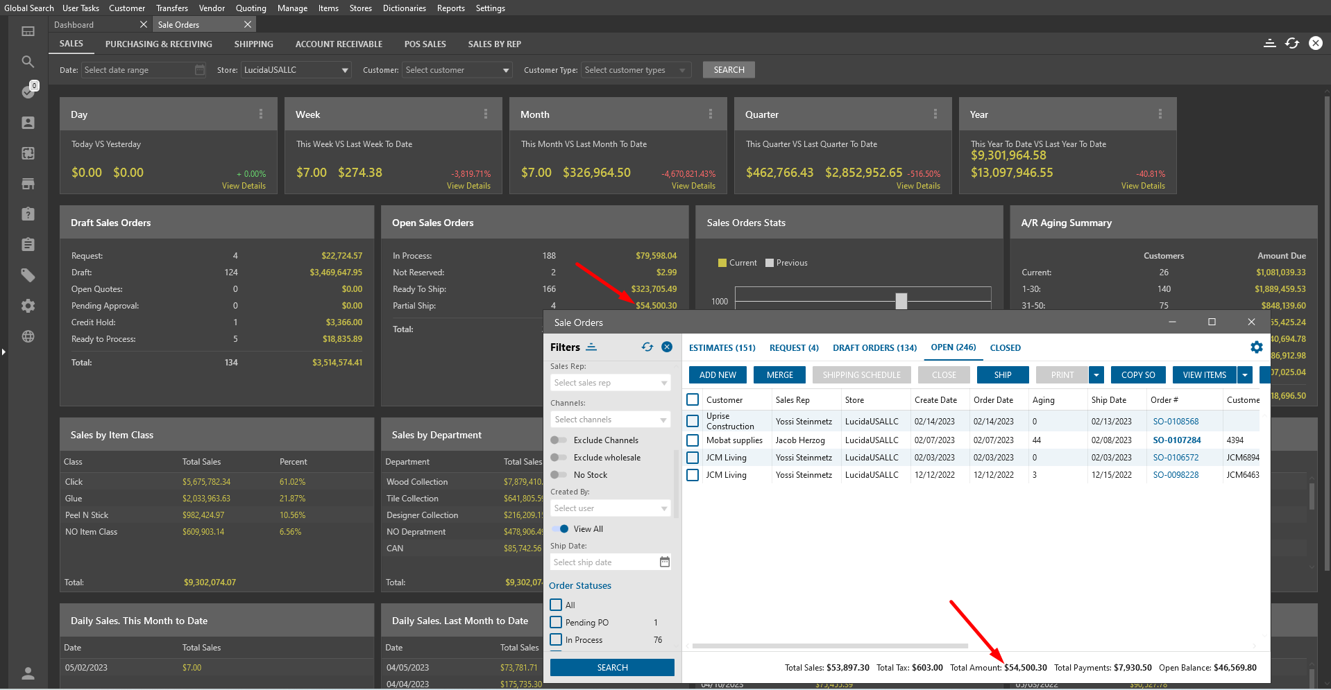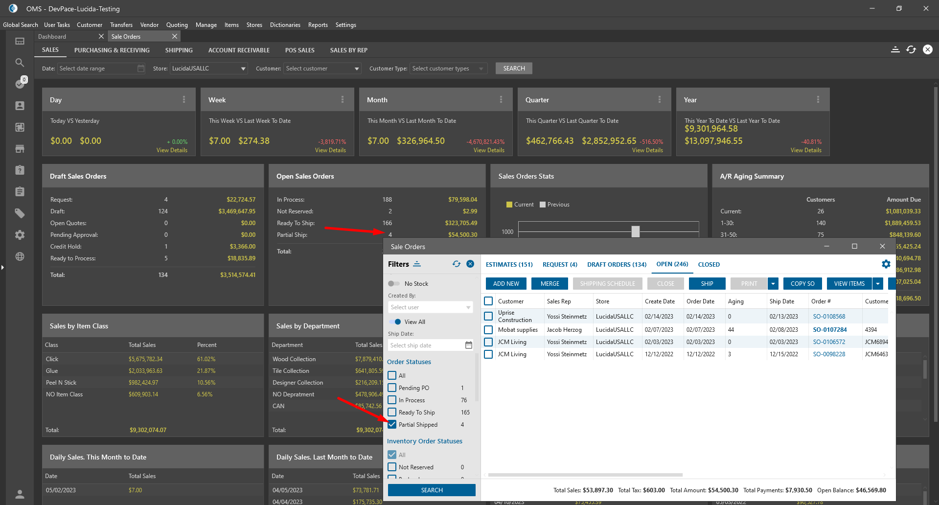 - Open Dashboard -> Open Sale orders -> press amount of “In process“ (or another “in process”, “not reserved“ “Ready to ship“ or “Partial ship“)