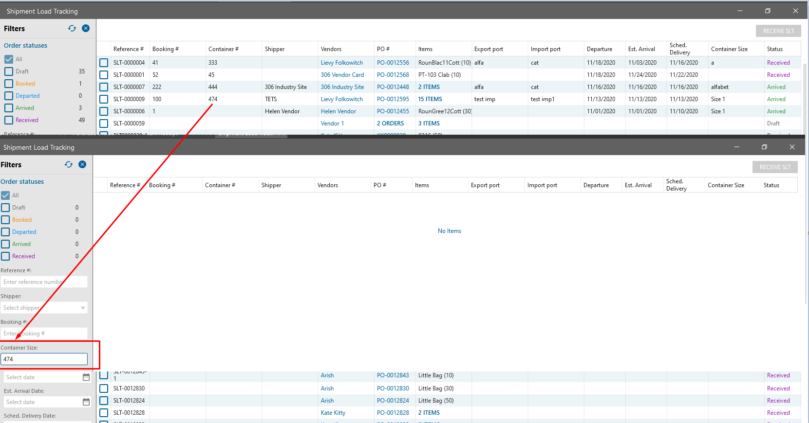 “Container size“ filter should be filtered by “Container size“ column, not by “Container #”.