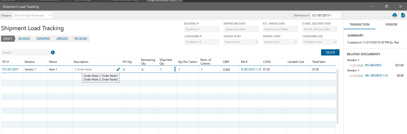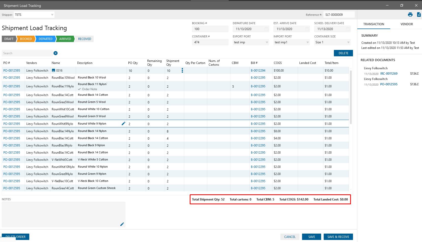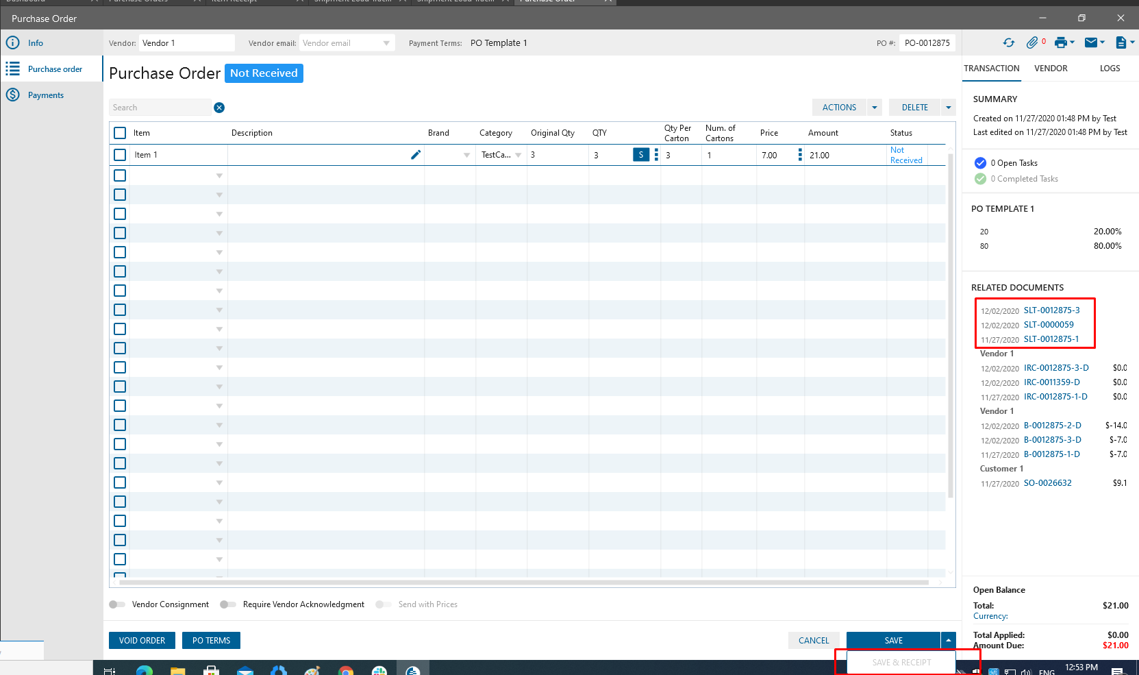 - In opened SLT edit form in Shipment Qty column enter 30 → Click Save and Receipt