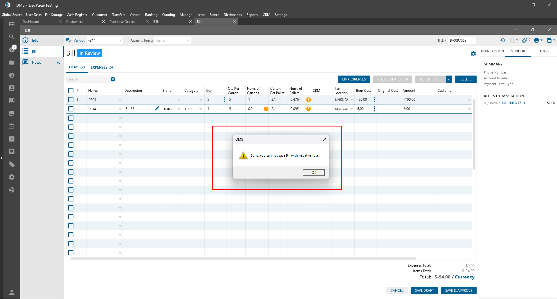 - Order can be saved with Negative item Amount on “Item and Expense tabs;